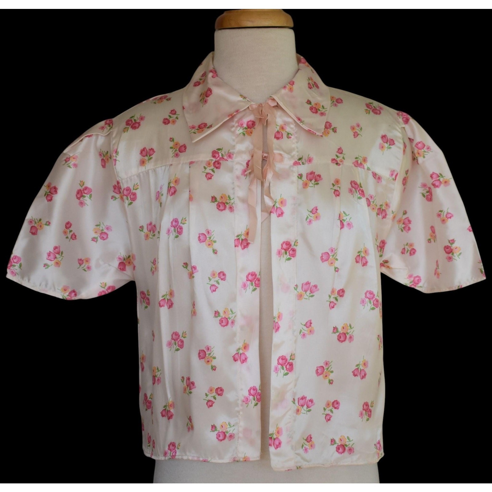 как выглядит Vintage 30s Pink Floral Print Rayon Satin Bed Jacket, Ribbon Tie Front, S - M фото