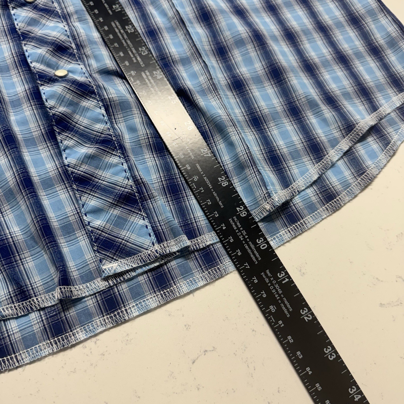 как выглядит Vintage Wrangler Blue Plaid Long Sleeve Pearl Snap Western Shirt Men