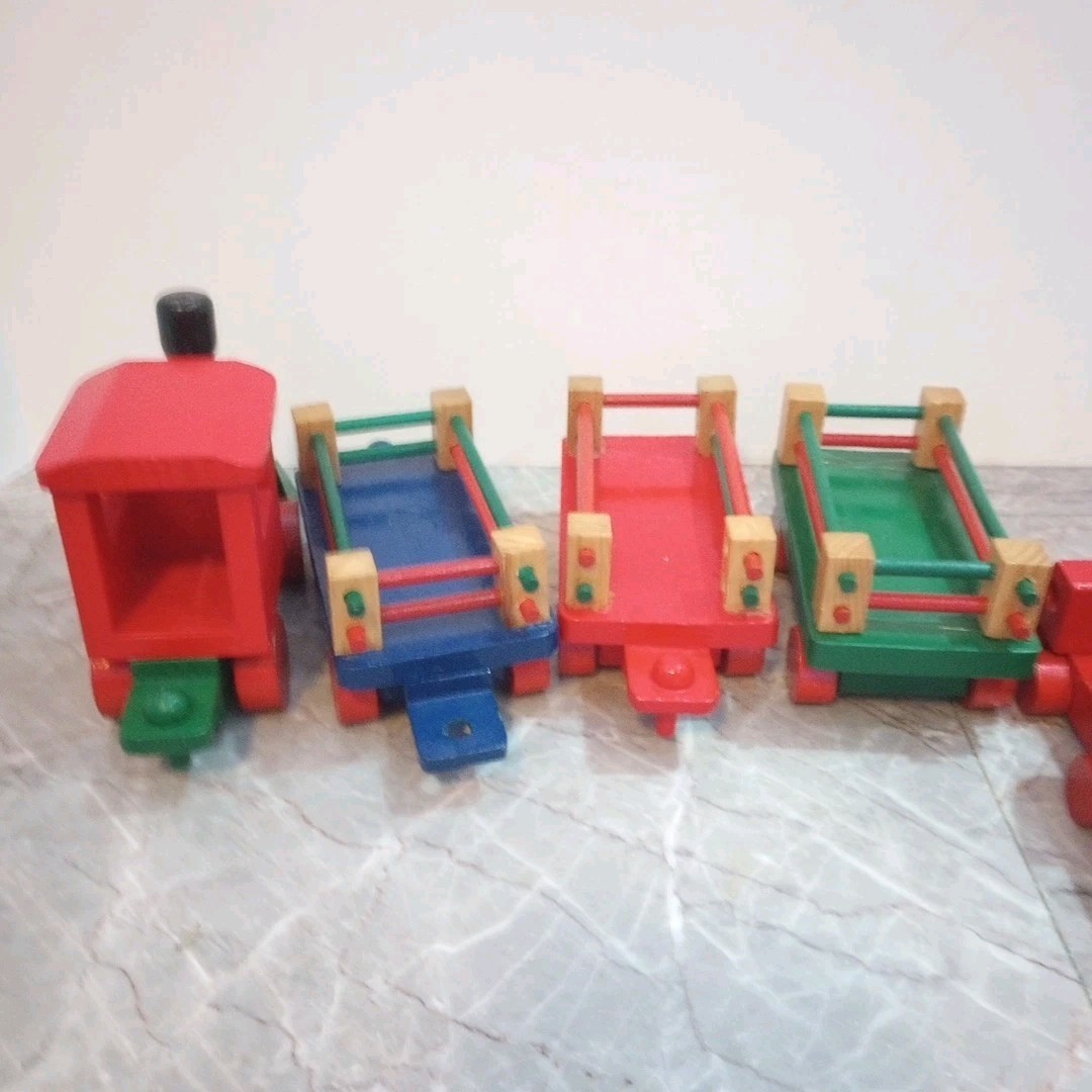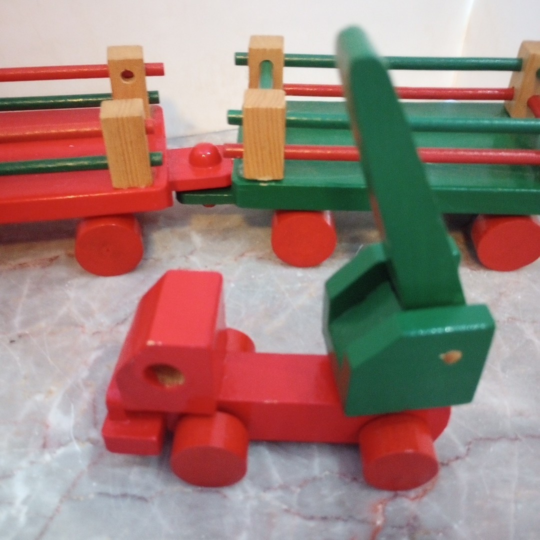как выглядит Vintage Wood Toy Train With Three Carry-on Wood Vehicles EUC фото