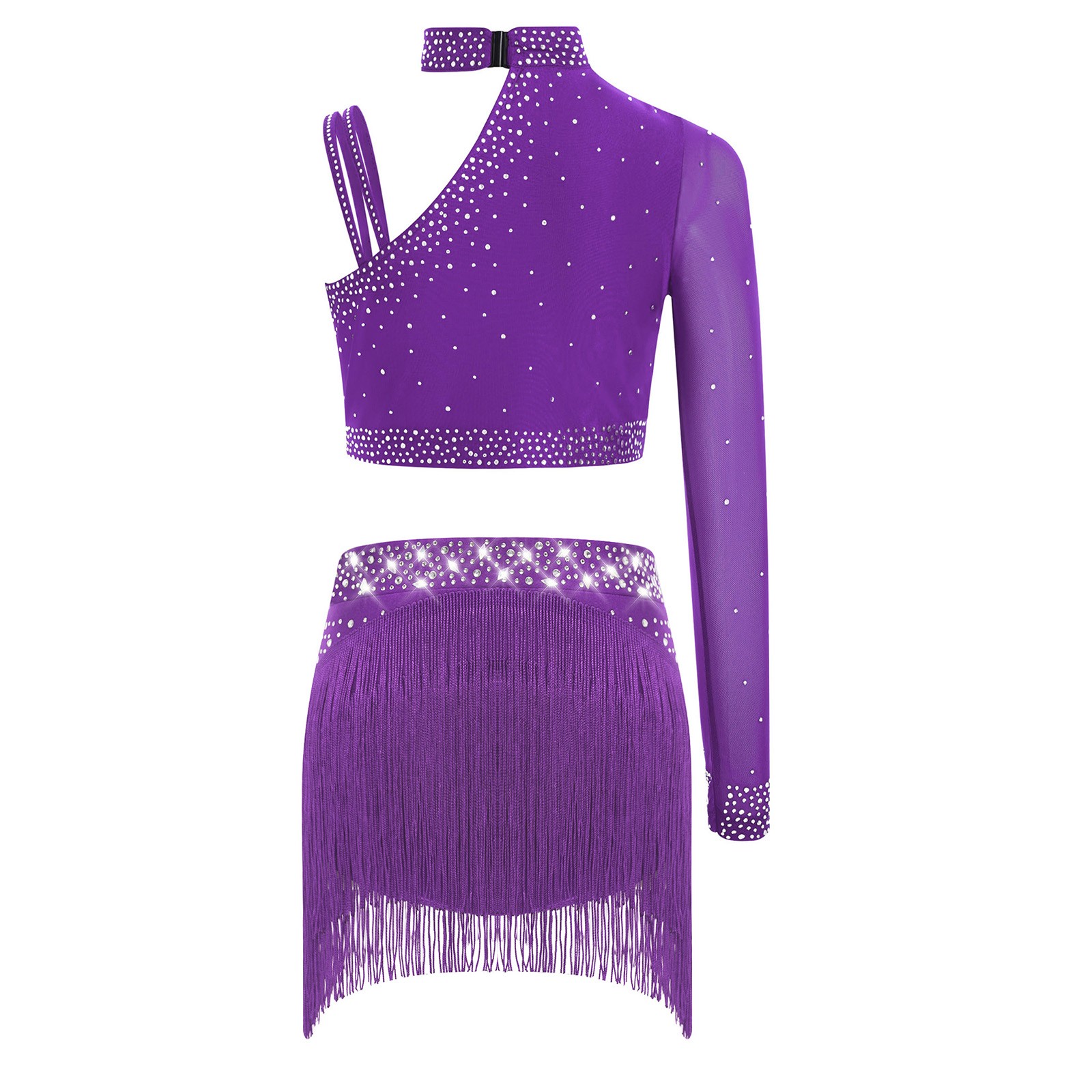 Kids Girls Outfits Asymmetrical Dress Irregular Dancewear Fringe Costume Shiny