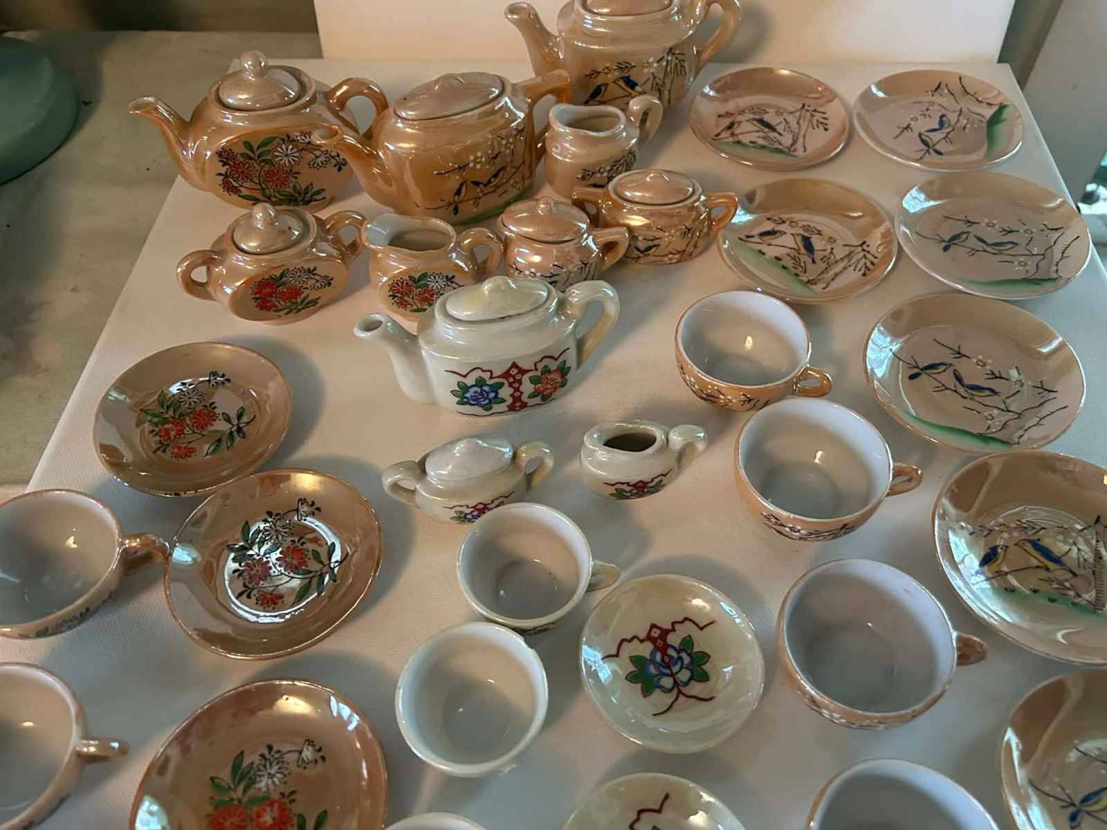 Vintage Japanese Lusterware Toy Tea Set Lot of 46 Bluebird Floral Hand Painted