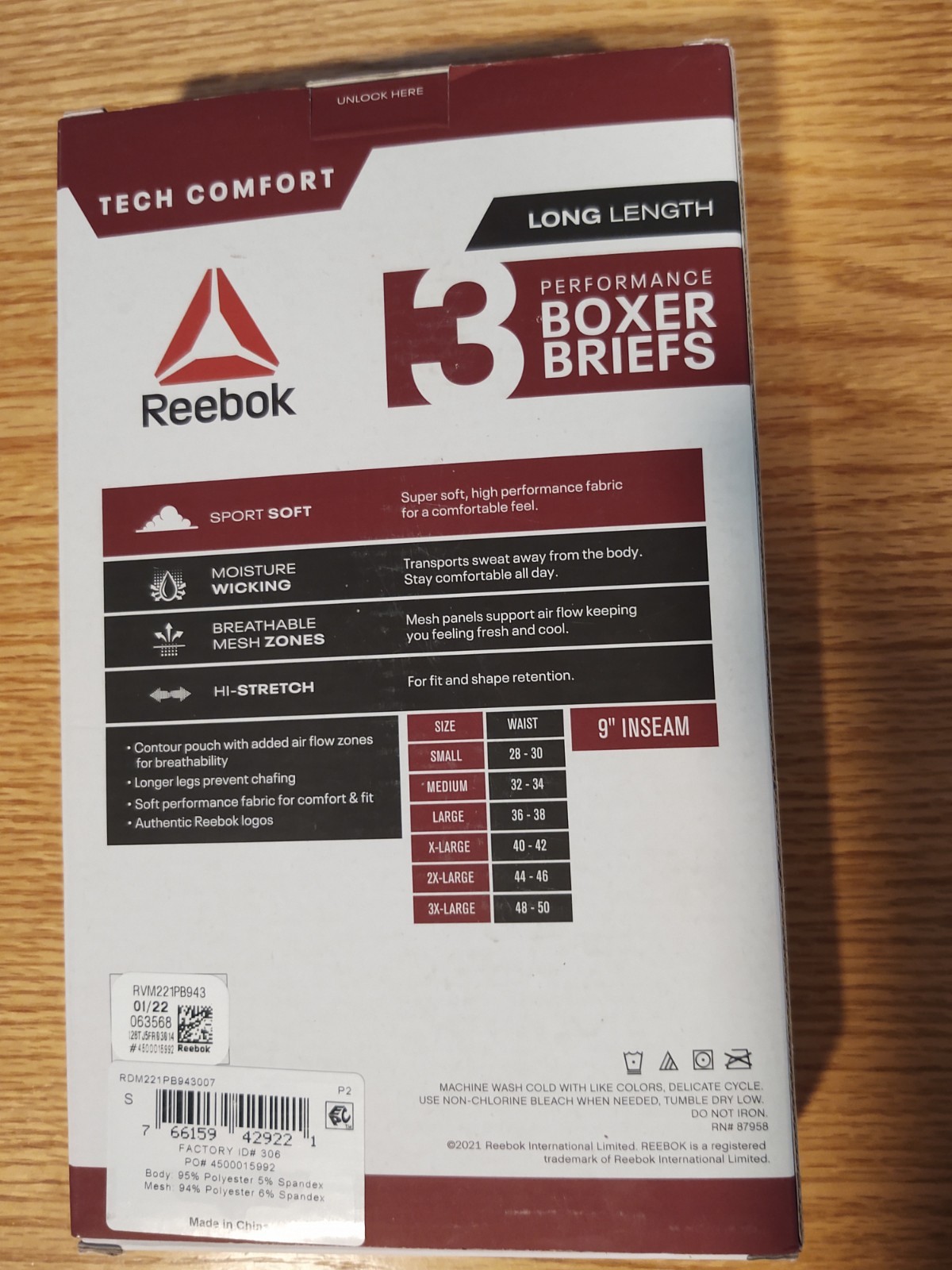 Reebok Performance Boxer Briefs Men's Small Size Long Length 3 Count Box