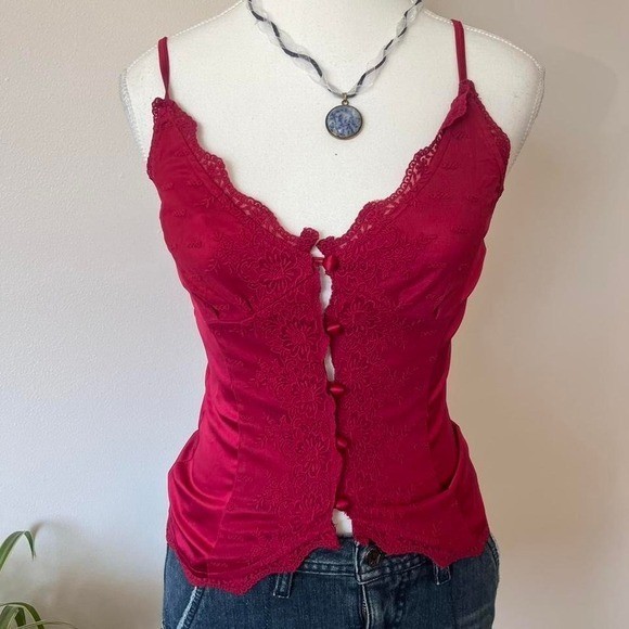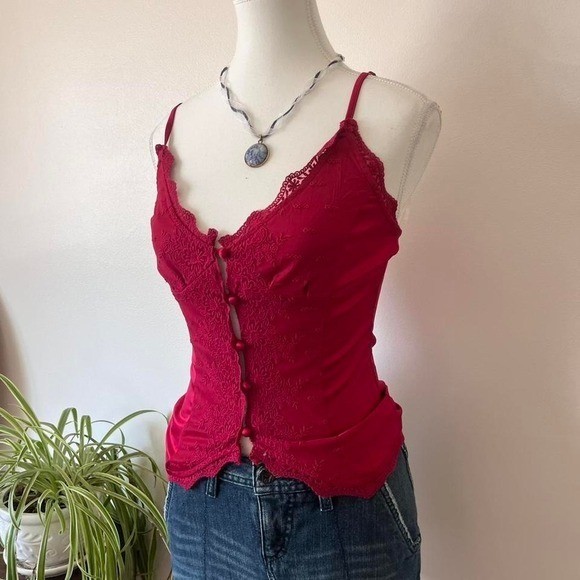 как выглядит Princess Polly Button Up Cami Womens Sz 4 Satin Red Lace Romantic dainty фото
