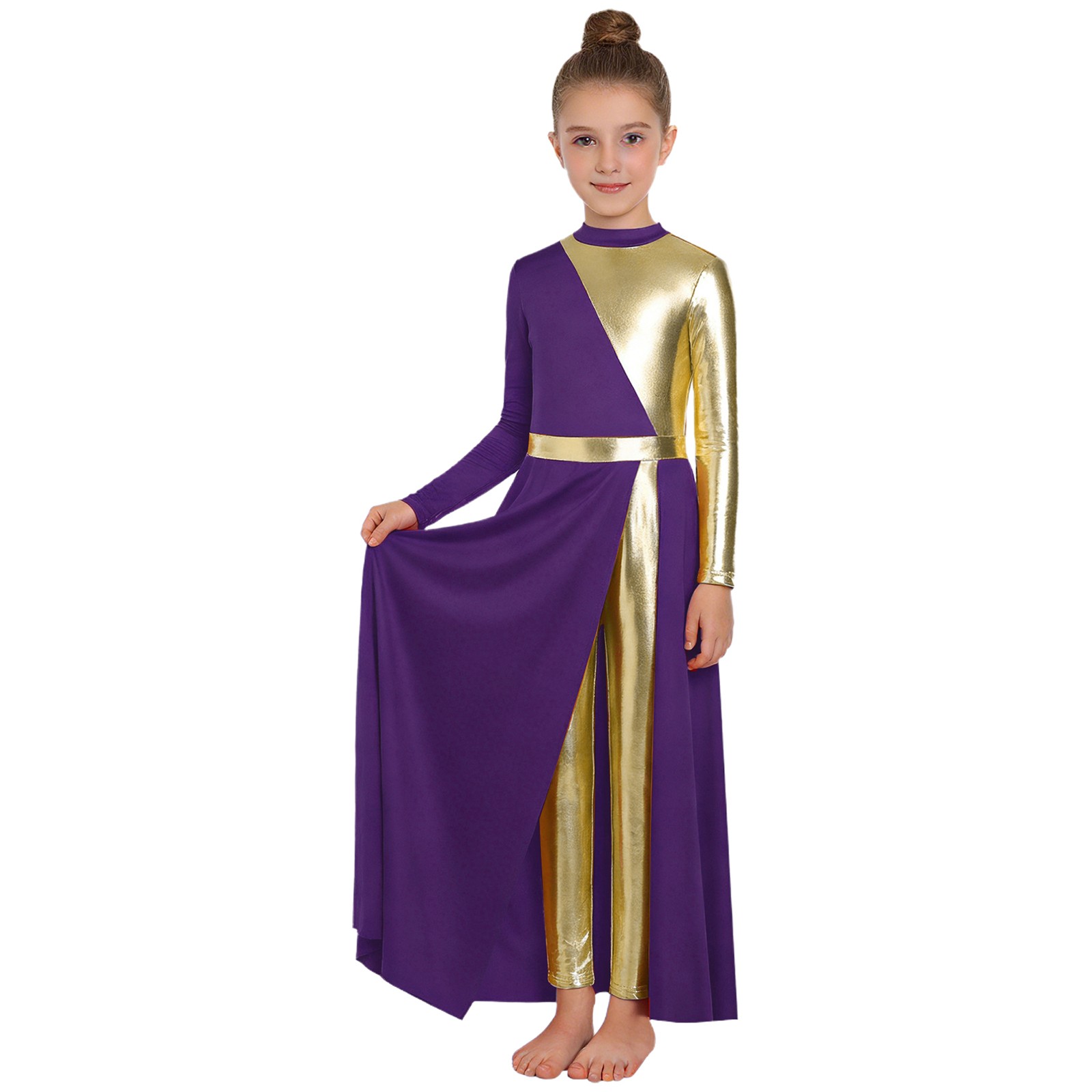 Kids Girls Worship Church Choir Costume Metallic Color Block Praise Dance Dress