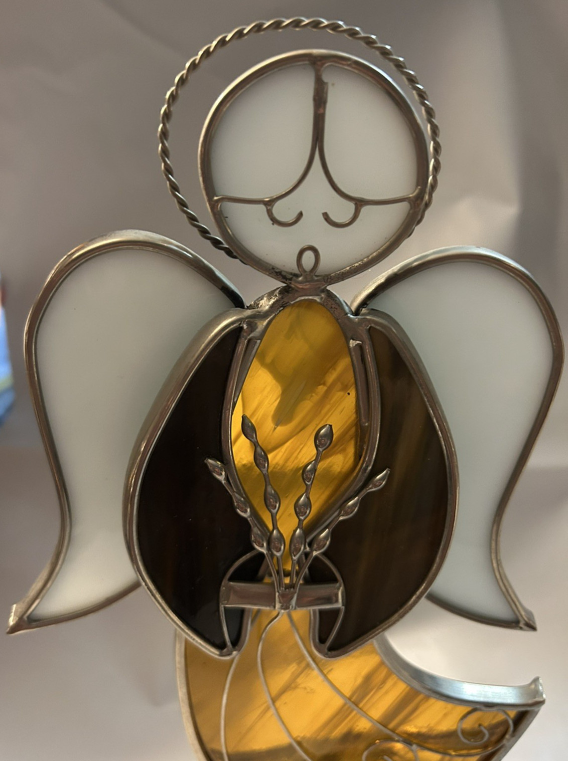 как выглядит Vtg Stained Glass Standing Angel Figurine Amber White Brown 9 Holding Flowers фото