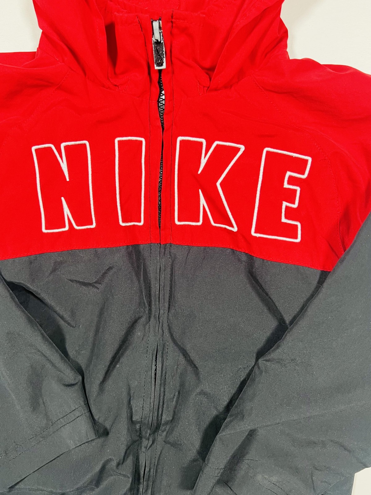 Nike Jacket Youth Size 5 Red Black Hooded Full Zip Windbreaker Spell Out Logo