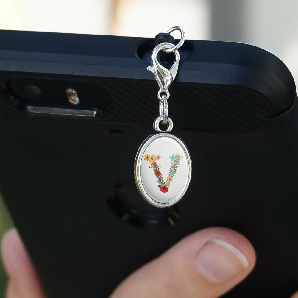 Letter V Floral Monogram Initial Mobile Cell Phone Headphone Jack Oval Charm