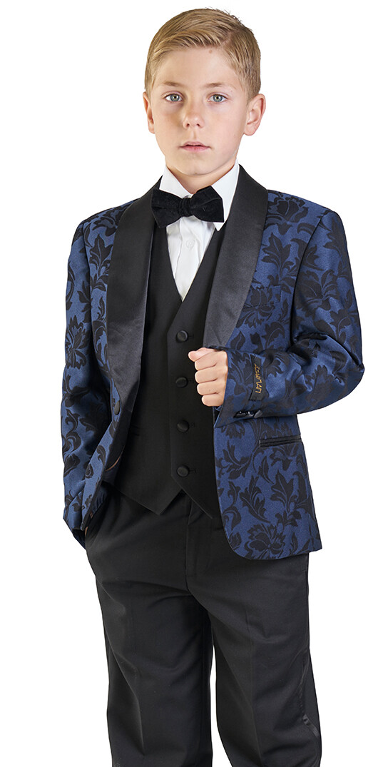 Boys Navy Floral Tuxedo Suit 5 Piece Set Shawl Kids Formal Dress AZARMAN 1714