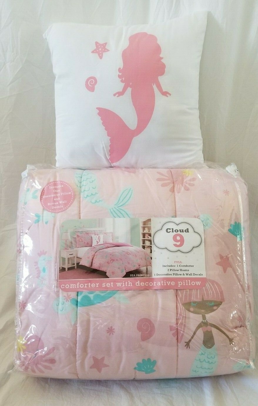 как выглядит 5 pc Cloud 9 Mermaid Full Comforter, Sham, Deco Pillow Wall Decal Set NIP фото