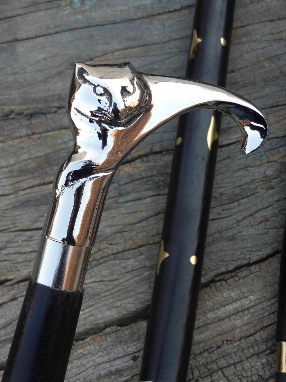 Nautical Brass Victorian Designer CAT Handle Wooden Walking Stick Cane Vintage