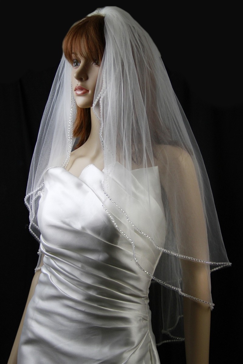 Bridal Wedding Veil Ivory 2 Tiers Long Fingertip Length With Rhinestone Edge
