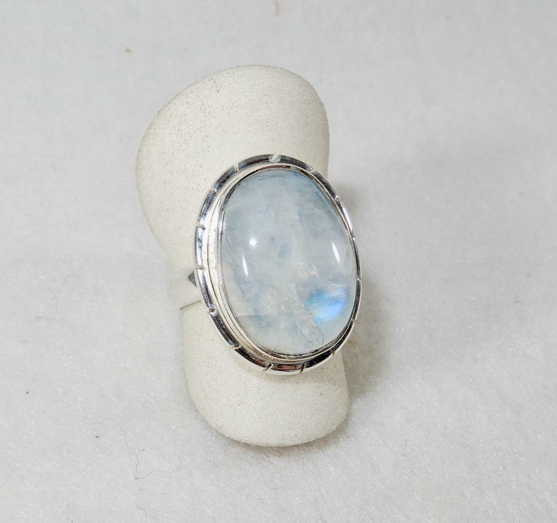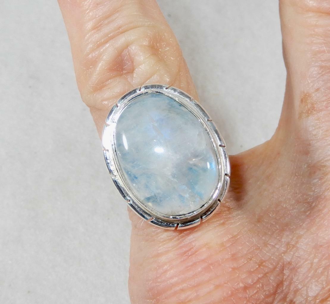 Rainbow Moonstone Flashy Blue Oval Ring Sterling Silver Size 6