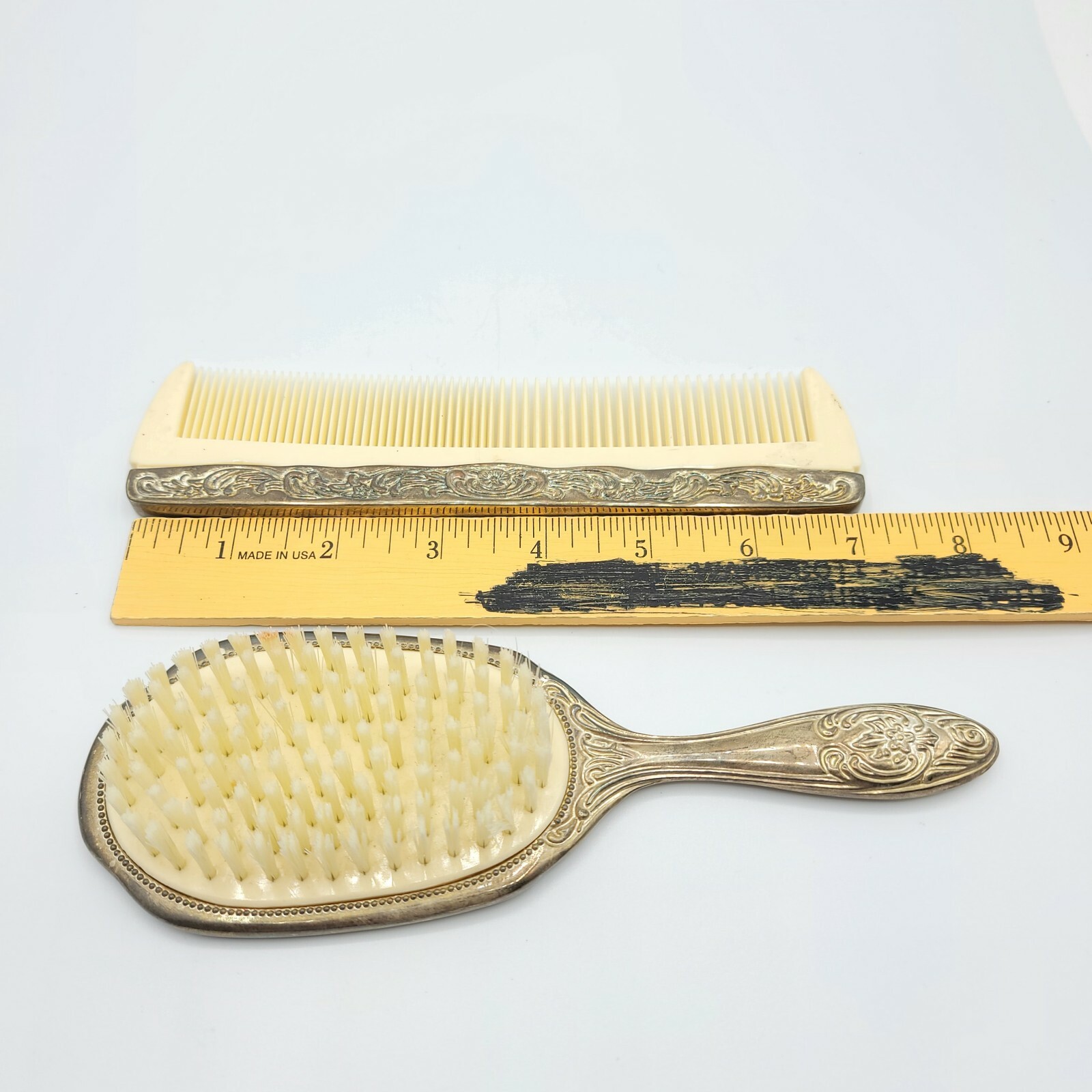 Vintage 2pc SET Brush Comb Set Grooming Vanity Celluloid Silverplate