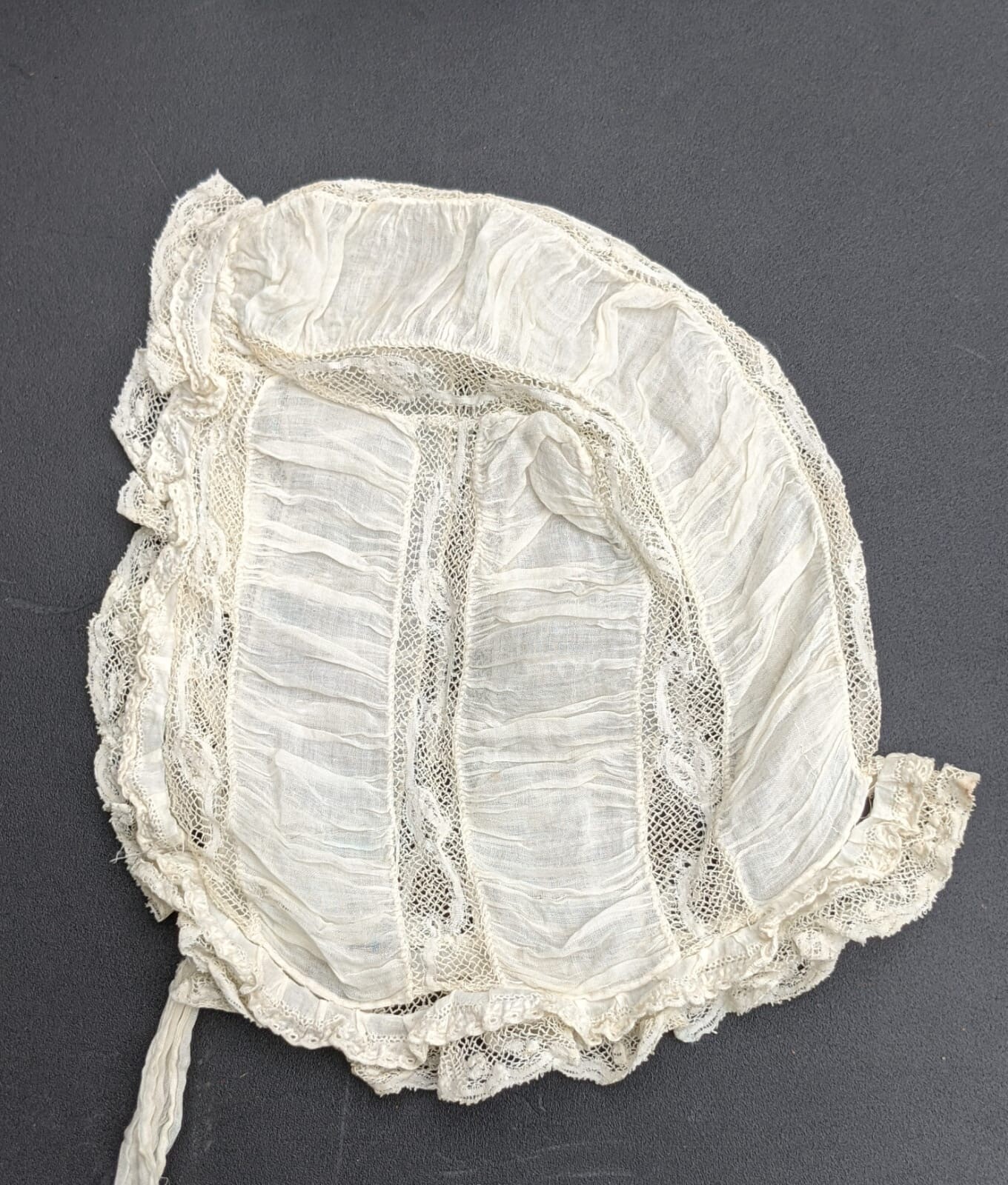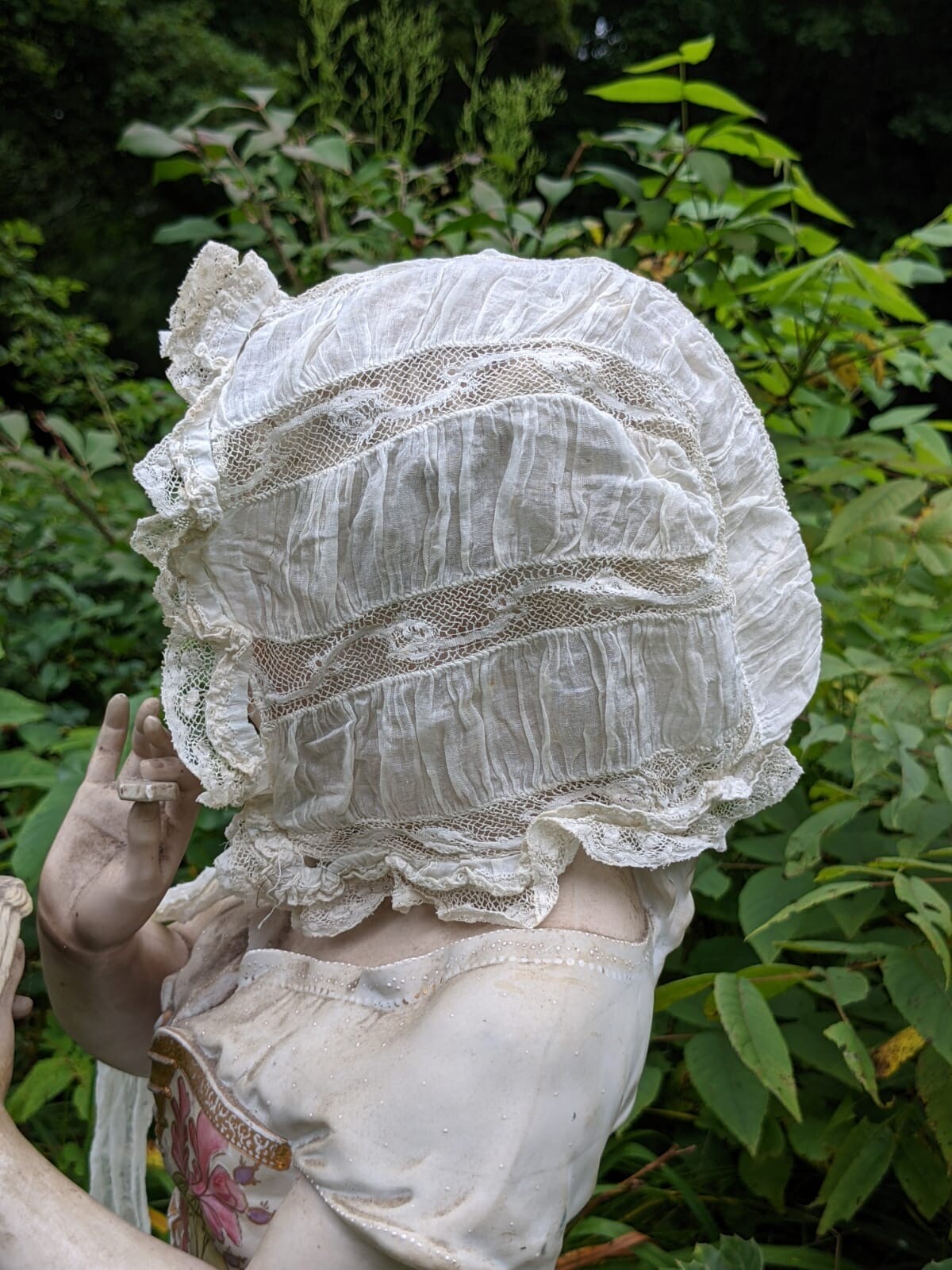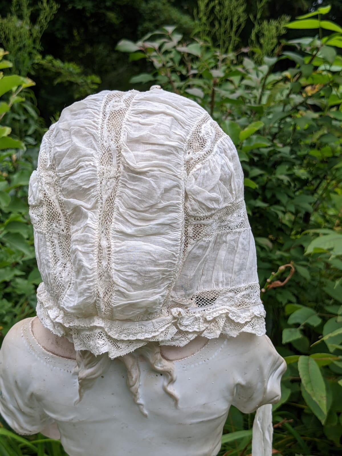 VICTORIAN RUCHED MUSLIN BONNET W VALENCIENNES LACE INSERTION - GREAT FOR DOLL