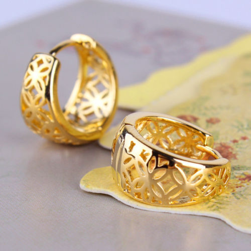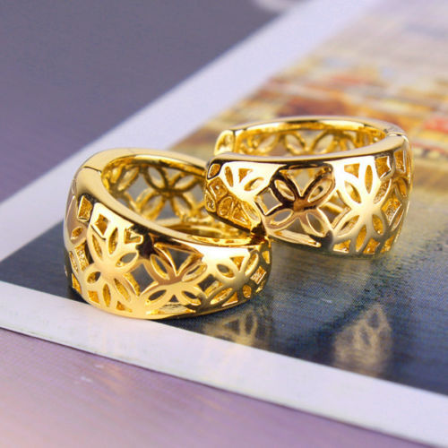 как выглядит Pretty New Yellow Gold Filled Shiny Hollow Cut Out Flower Huggie Hoop Earrings фото
