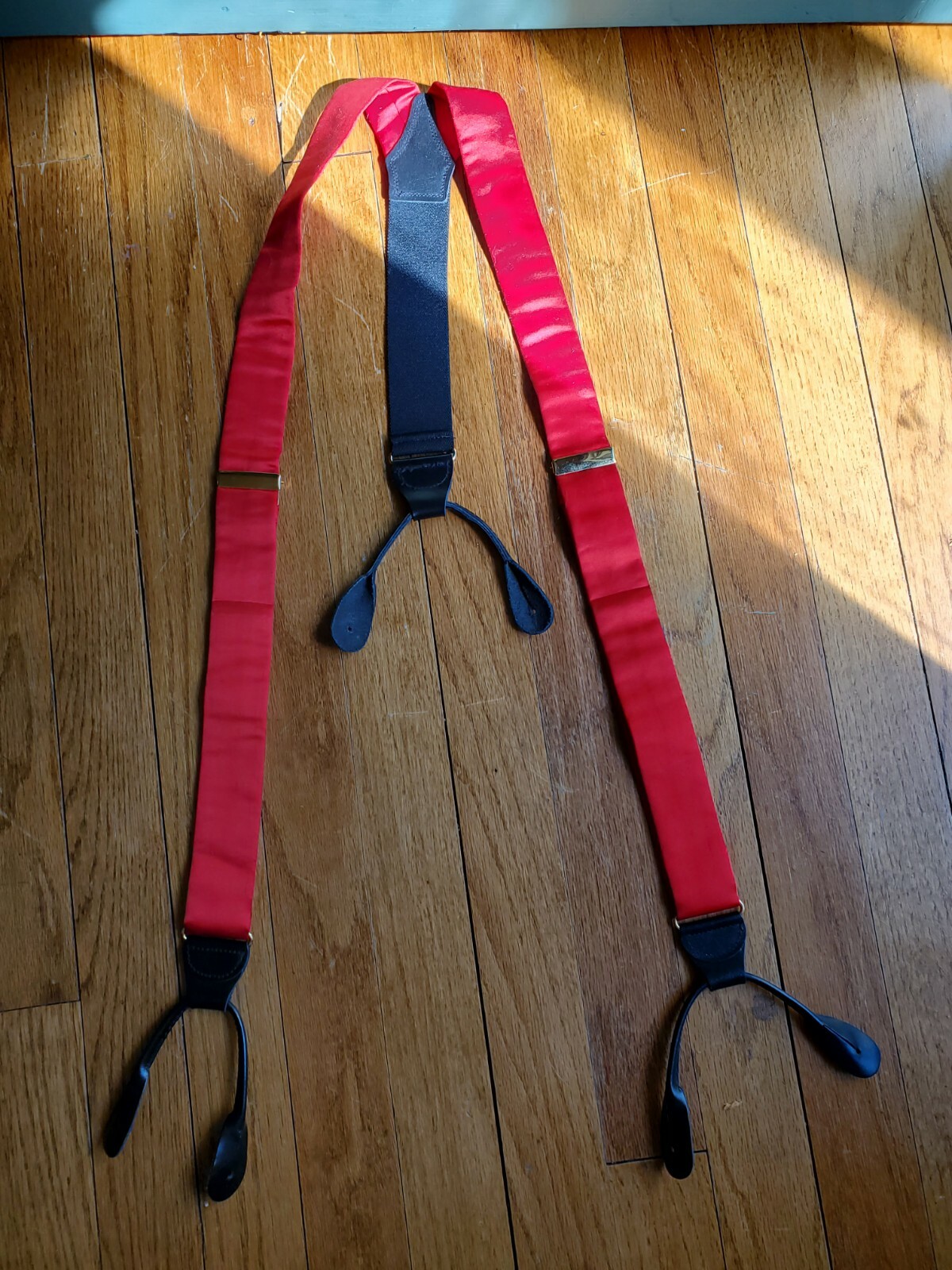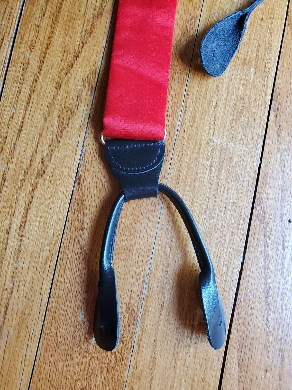 NWOT Vintage 1990s Pelican Red Satin Suspenders Fabric Leather Brass 1.5 Wide