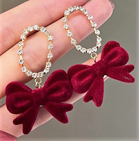 как выглядит Elegant Red BOW Velvety Oval Rhinestone CHRISTMAS Gift Valentine Day Earrings H5 фото