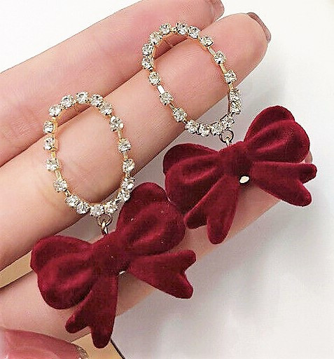 Elegant Red BOW Velvety Oval Rhinestone CHRISTMAS Gift Valentine Day Earrings H5