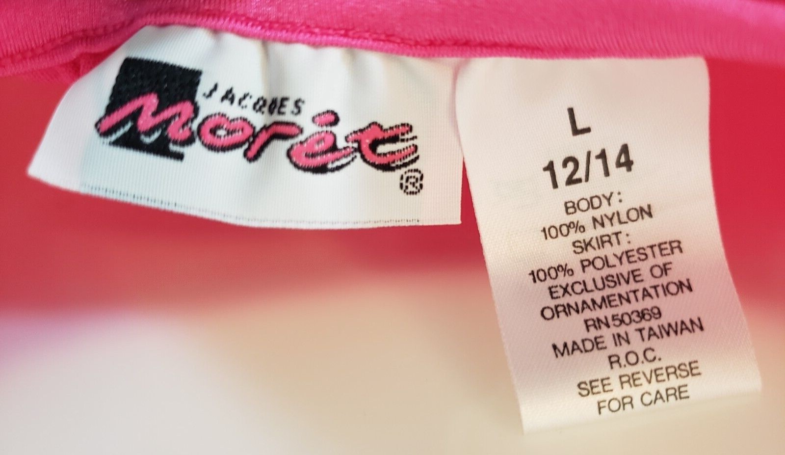 Moret Dancewear Hot Pink Leotard, Attached Skirt Child's Size L 12-14 w/Bow