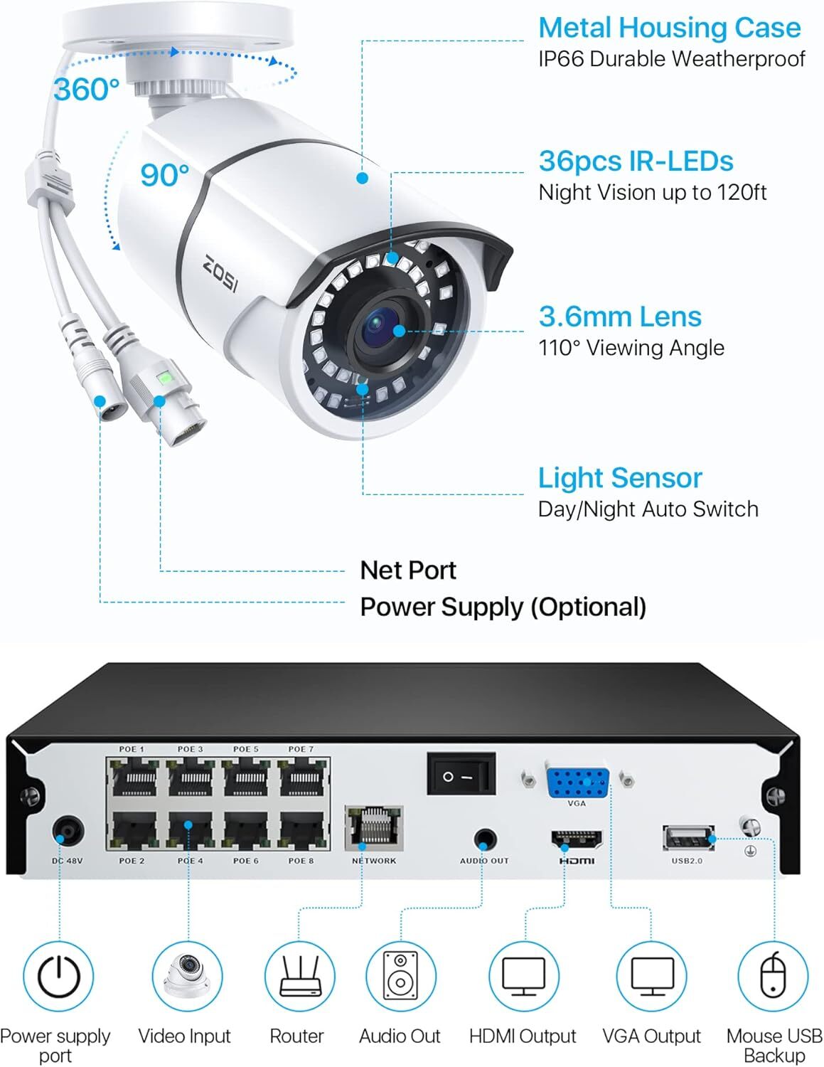 ZOSI 8CH 5MP PoE NVR System 2K PoE IP Outdoor Securtiy Camera 1TB HDD