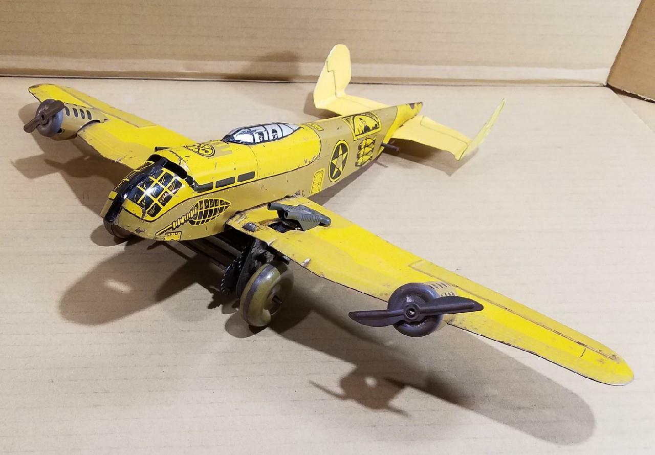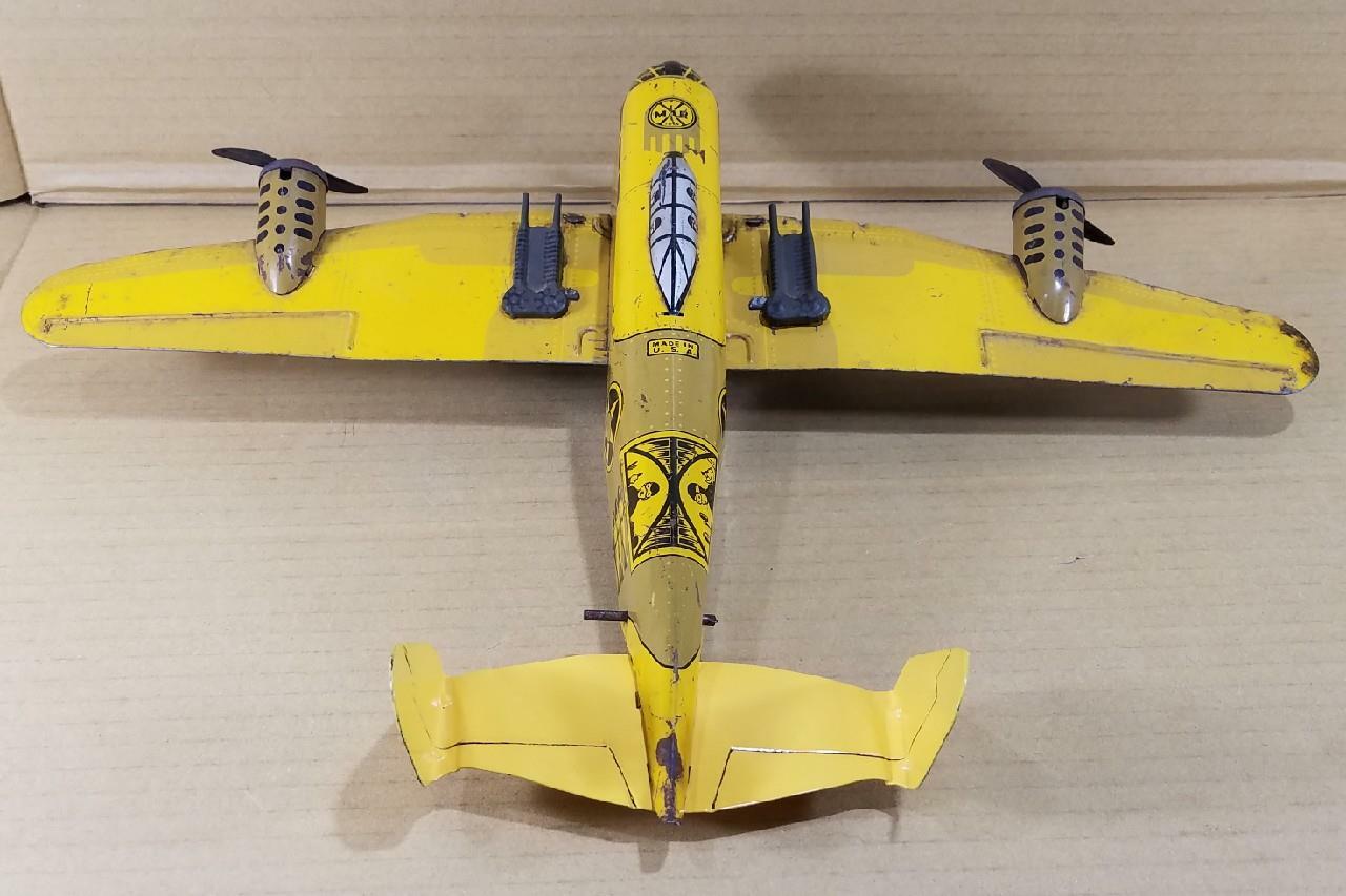VINTAGE MARX WIND UP TIN WWII US BOMBER PLANE - 18 WINGSPAN - COMPLETE - WORKS