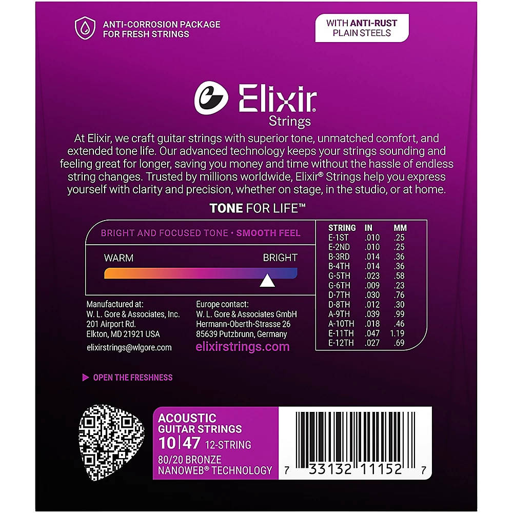 Elixir 80/20 Bronze 12-String Acoustic Guitar Strings NANOWEB Light .010-.047