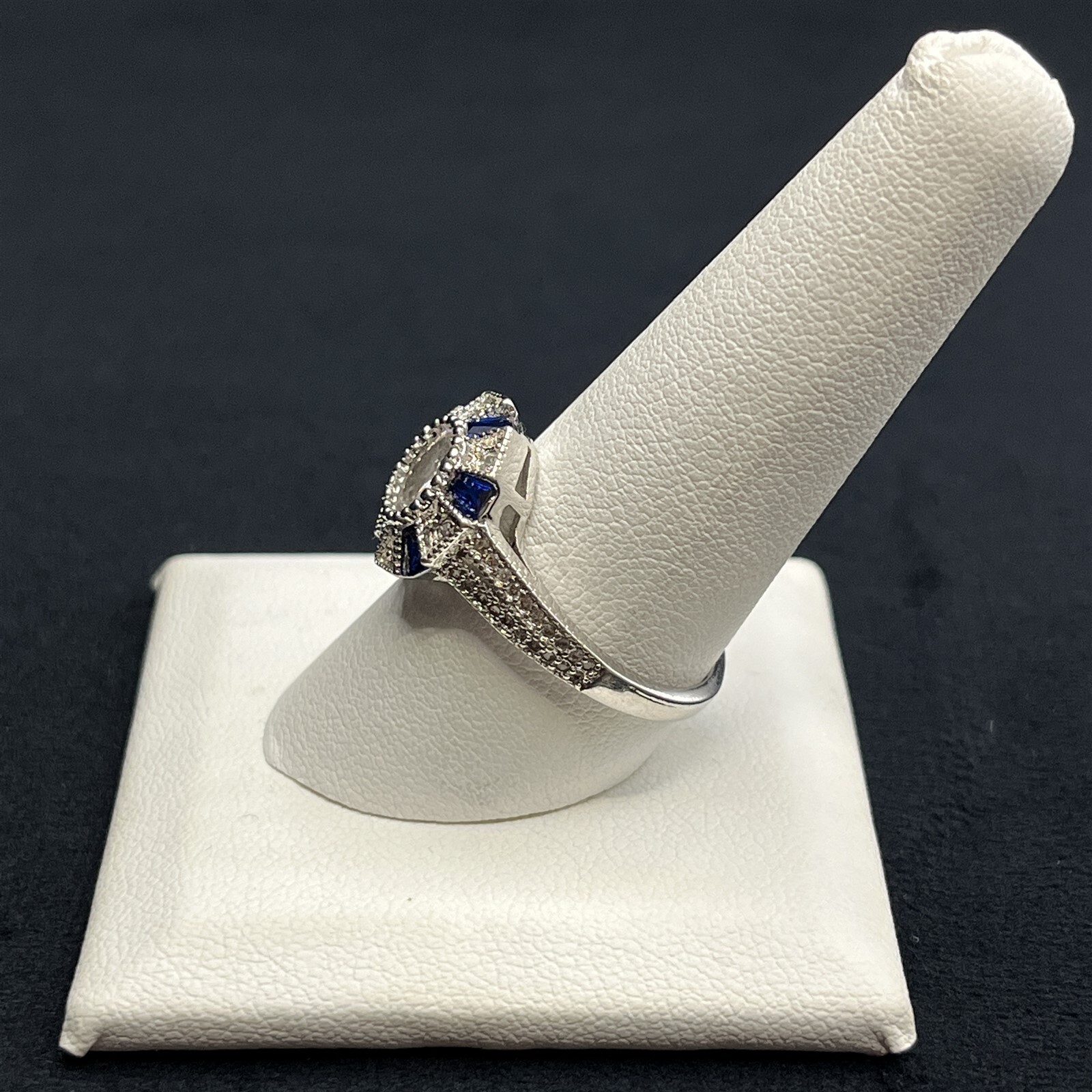 Elegant Blue Spinel White Zirconia Milgrain Cocktail Sterling Silver Ring Size 9