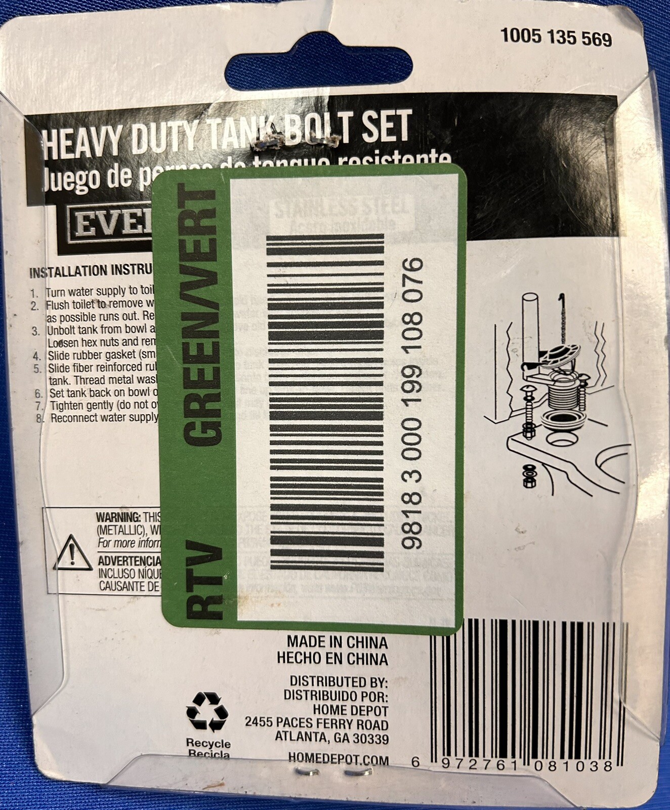 Heavy Duty Tank Bolt Set with 3 Stainless Steel Bolts 1005 135 569