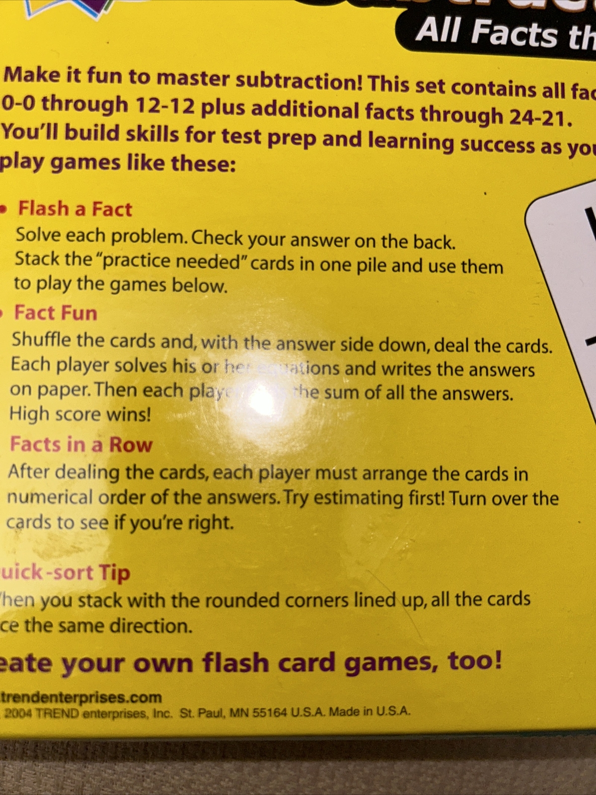 Trend Subtraction All Facts Through 12 Flash Cards, Set of 169 New Teaching