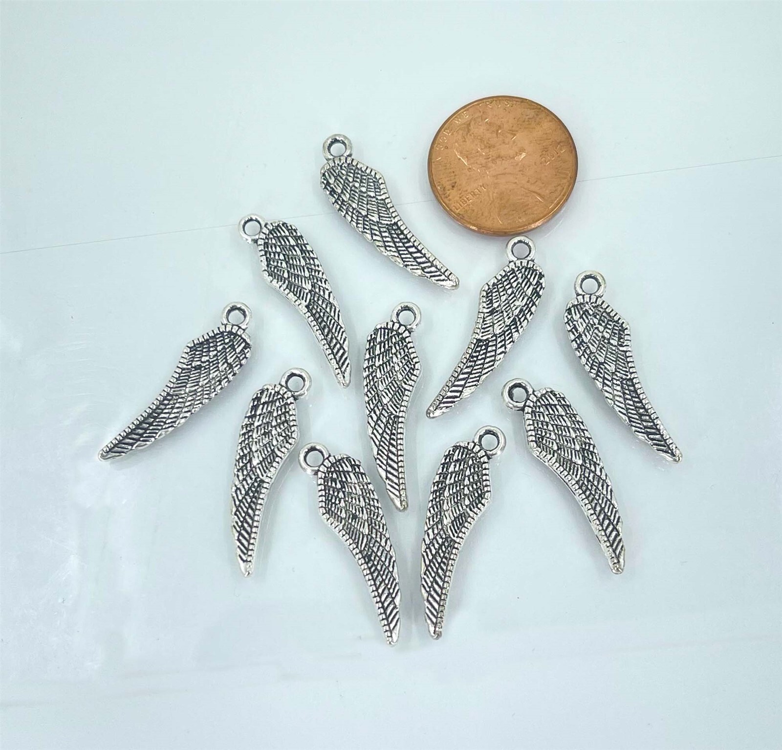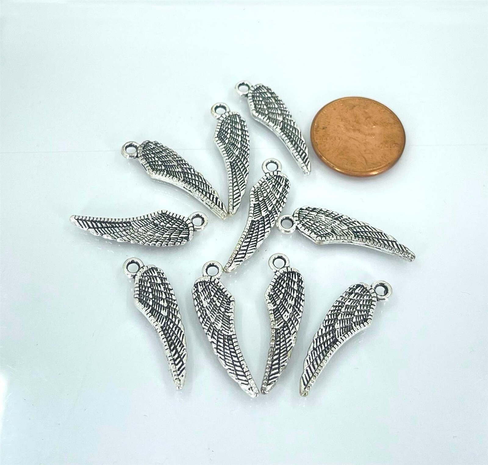 10 Angel Wings Charms Antique Silver Pewter Two Side Feather Pendant 26x7mm