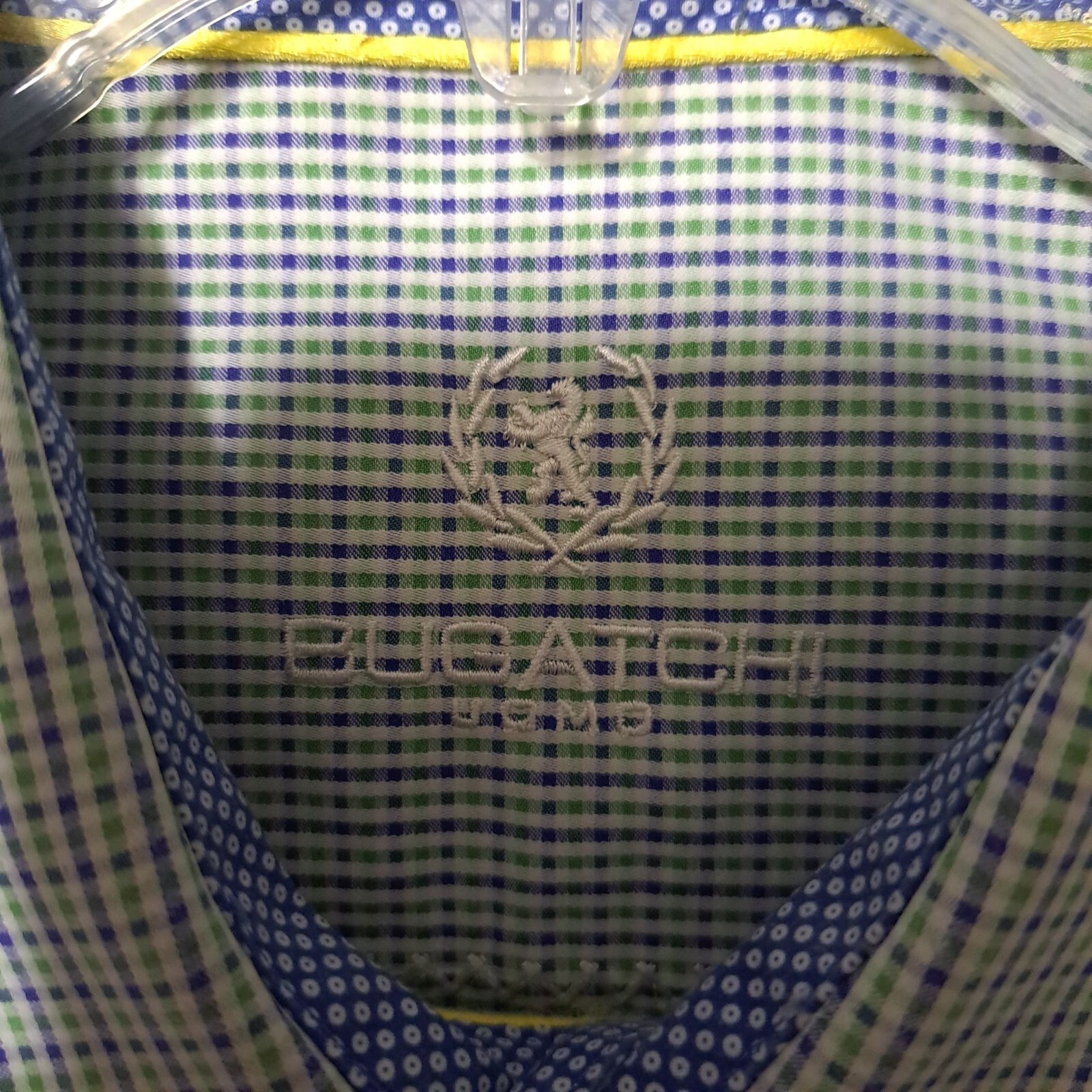 как выглядит Bugatchi Uomo Mens Dress Shirt 17" Blue Green Plaid Long Sleeve Button Up фото