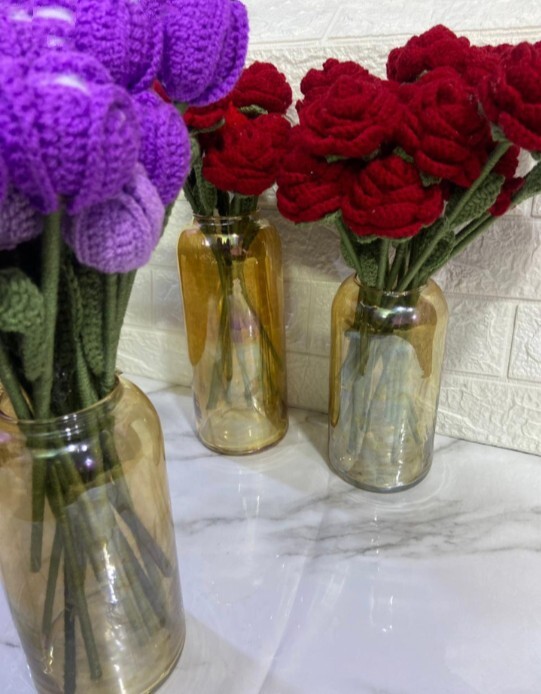 как выглядит Knitted Crochet Red Rose Flower Floral D cor Knit Bouquet Handmade Vtg 9 Pieces фото