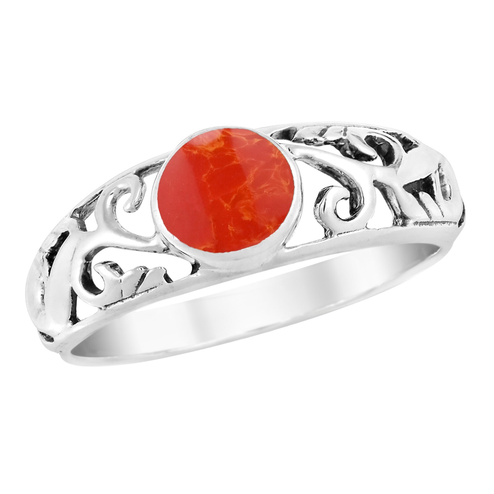 Intricate Lace Swirl Vines Round Red Coral Sterling Silver Ring-7