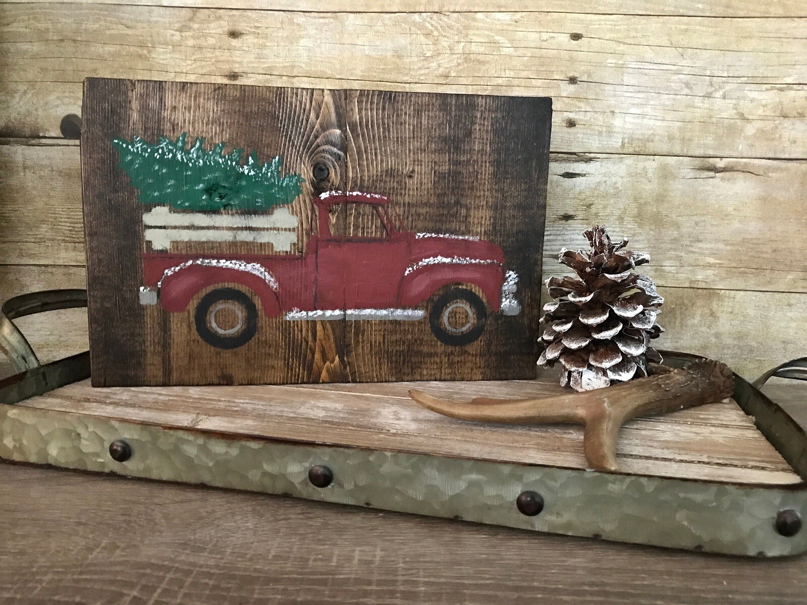 Christmas Decor / Red Pickup Truck / Christmas Tree / Rustic Wood Block Sign