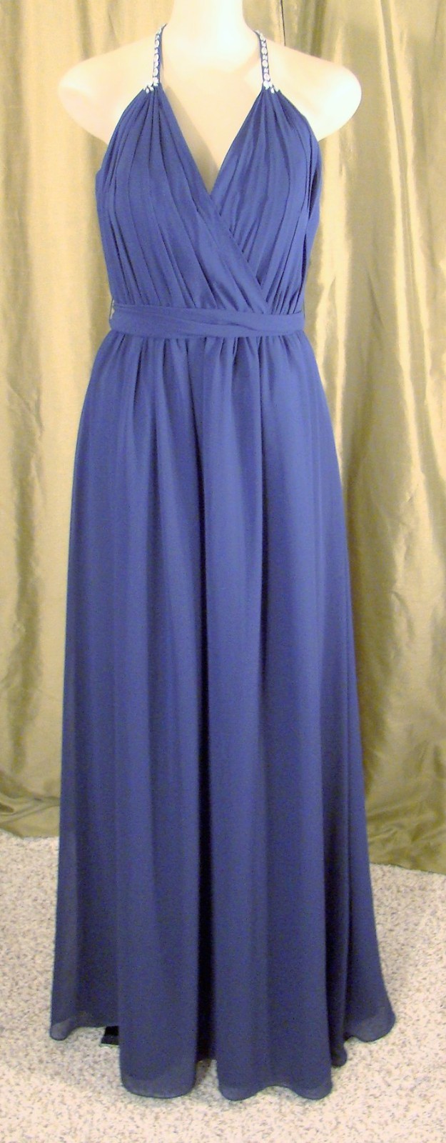 Draped Chiffon Embellished Crystal Neckline Navy Blue Sz 10 Formal Prom Dress