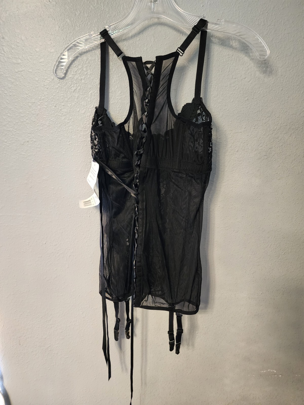 как выглядит New Corset Garter w/ Strap G-string Ruffles Black Lace Shirley of Hollywood Med фото