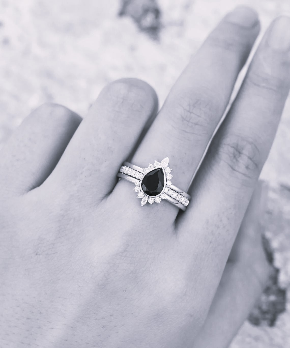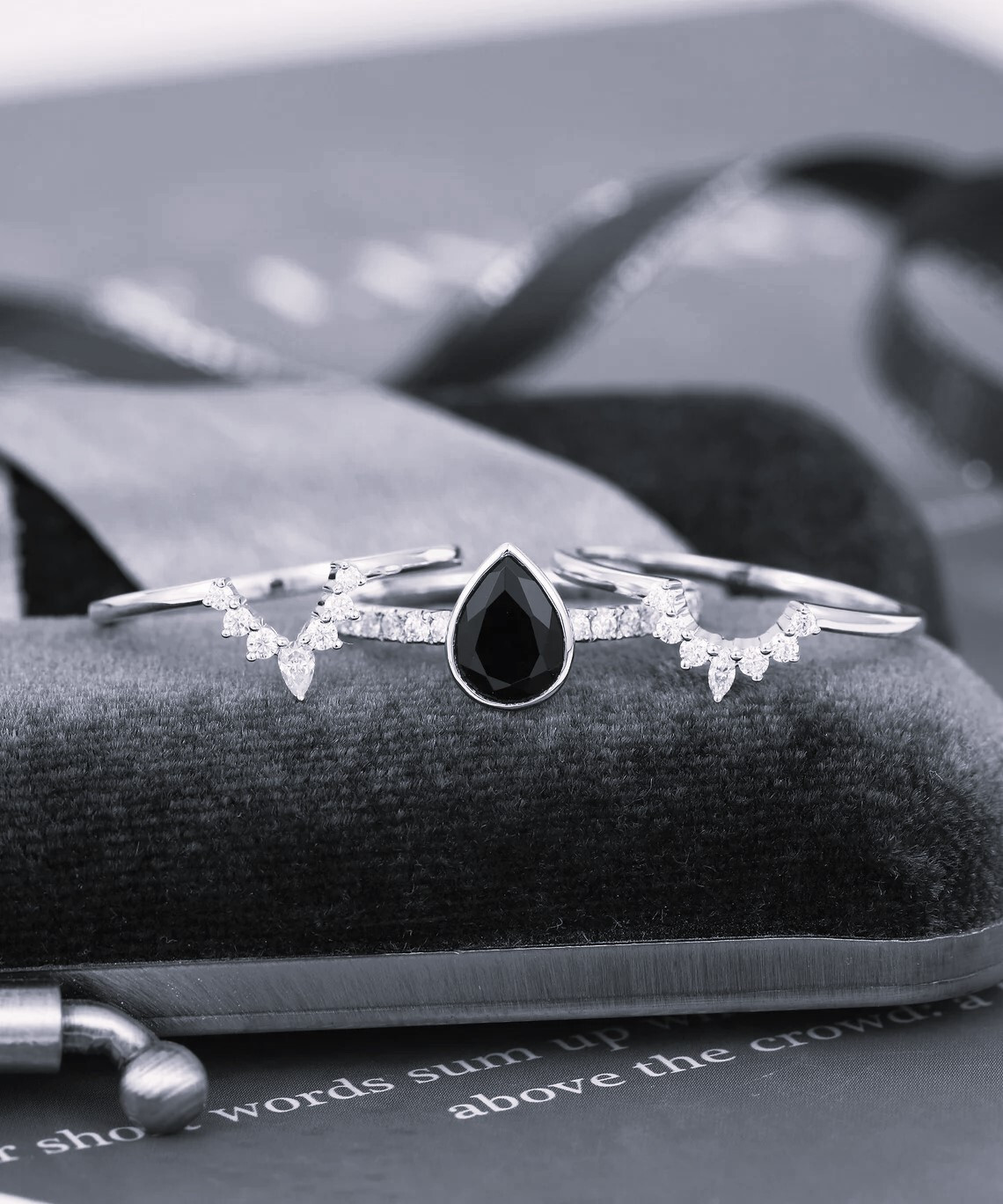 1.25Ct Black Pear Cut Onyx Trio Wedding Ring Set in Solid 925 Sterling Silver