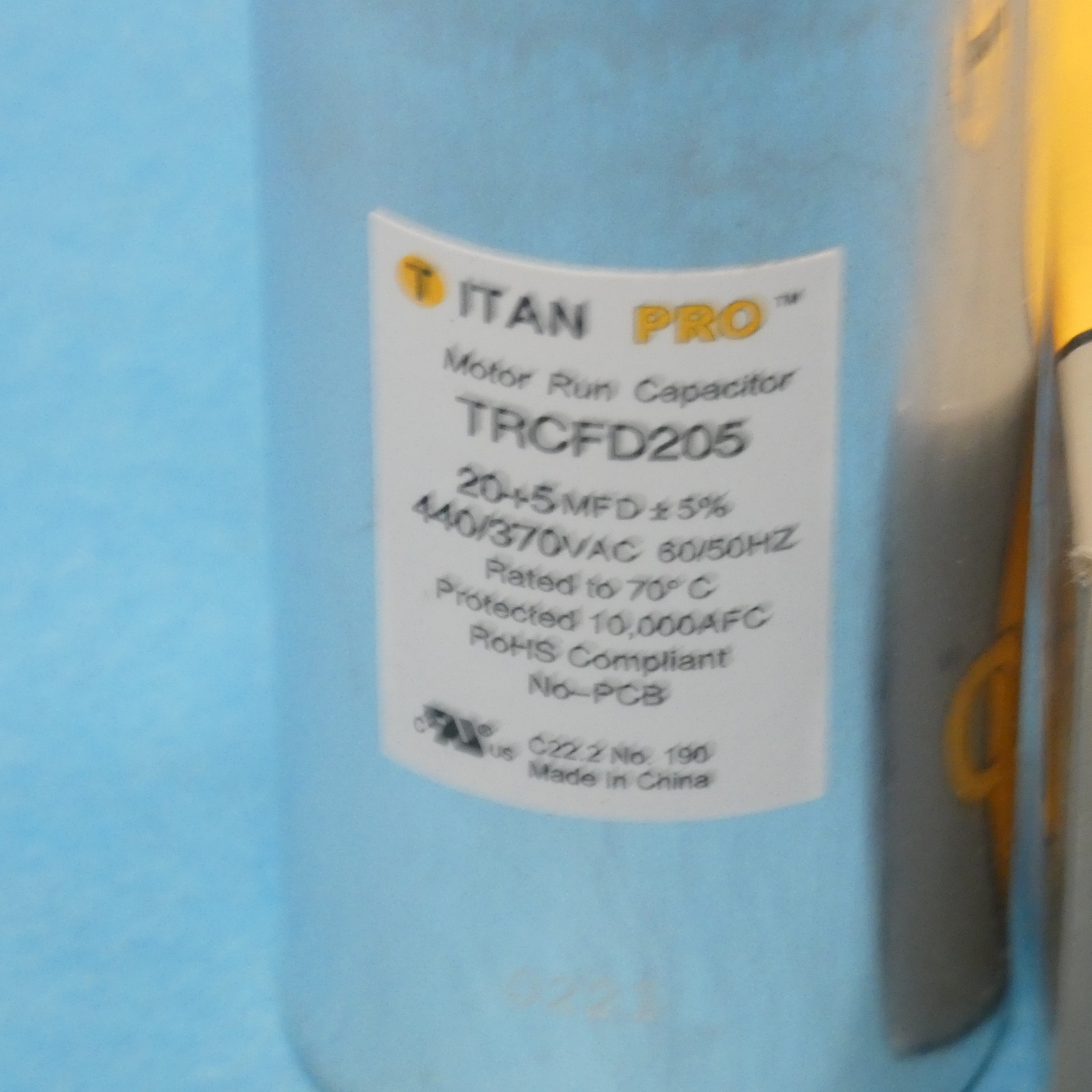 • Titan Pro TRCFD205 Motor Run Dual Capacitor 20 5 MFD 440/370 Volts Round