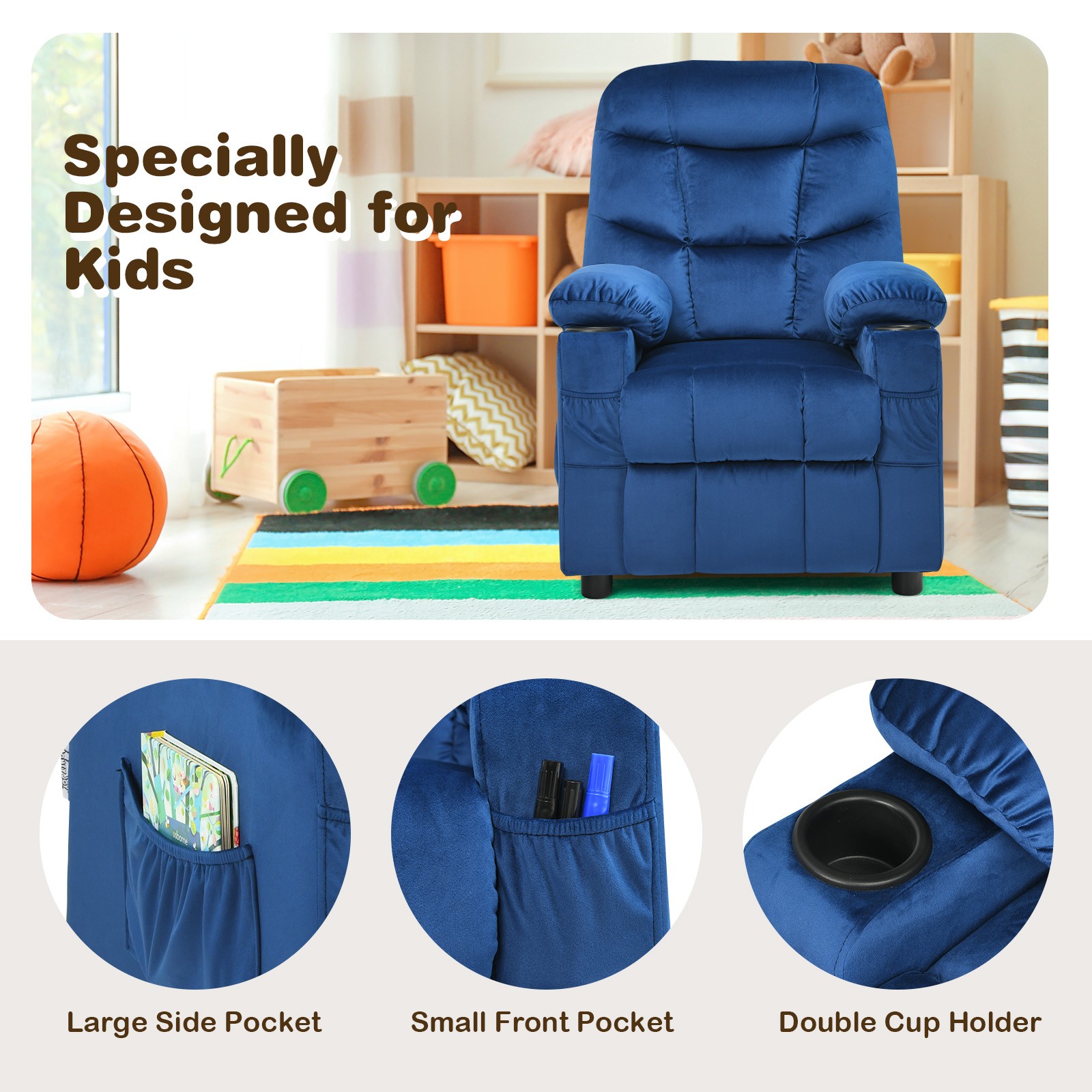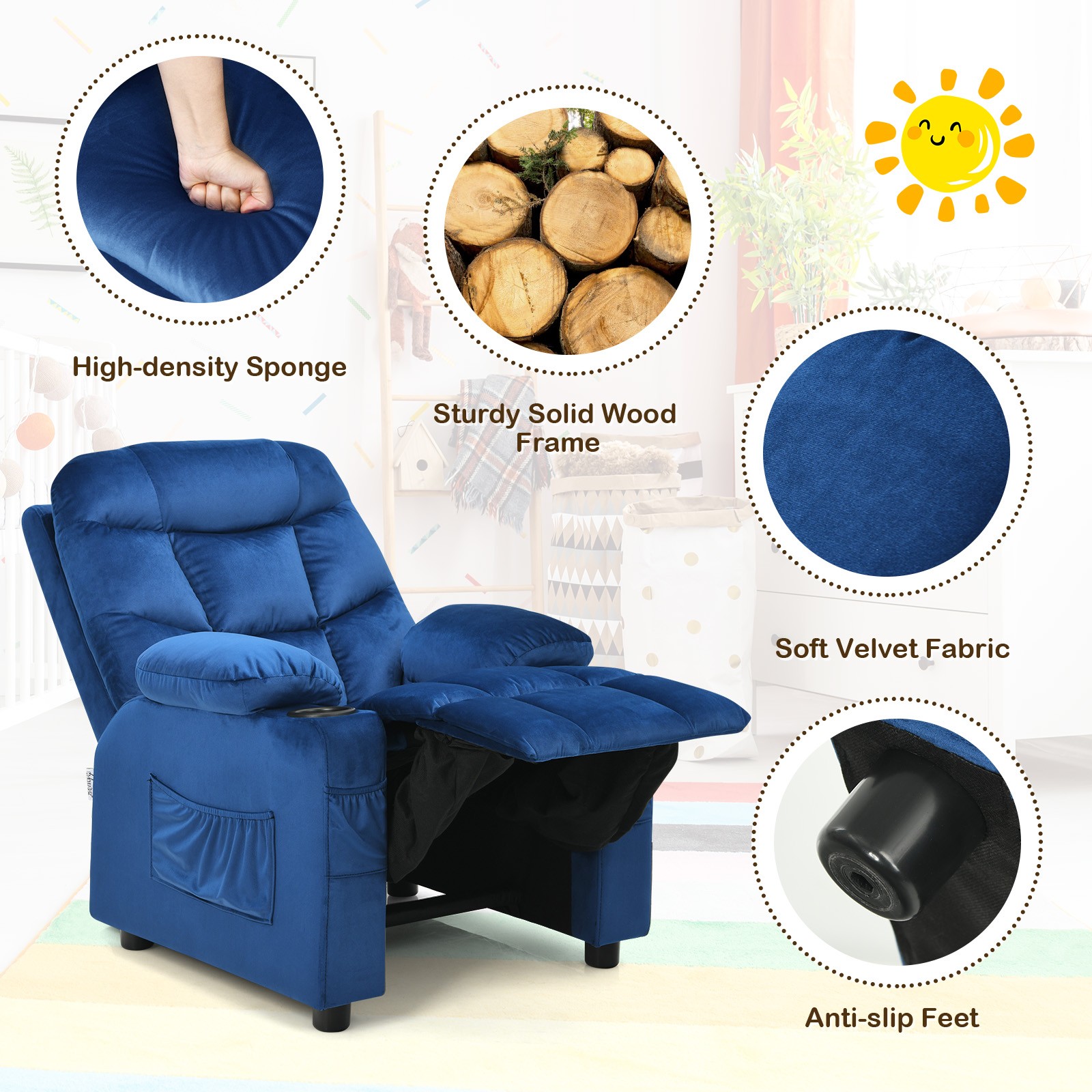 Costway Kids Youth Recliner Chair Velvet Fabric w/Cup Holder Side Pocket Blue
