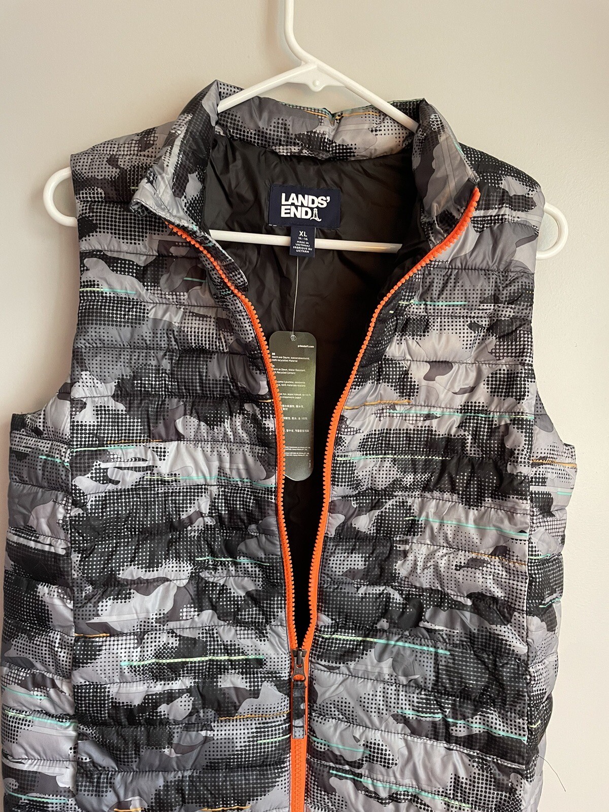 Lands End Boys Winter Puffer Vest Size XL 14-16 Black Gray Camouflage NEW