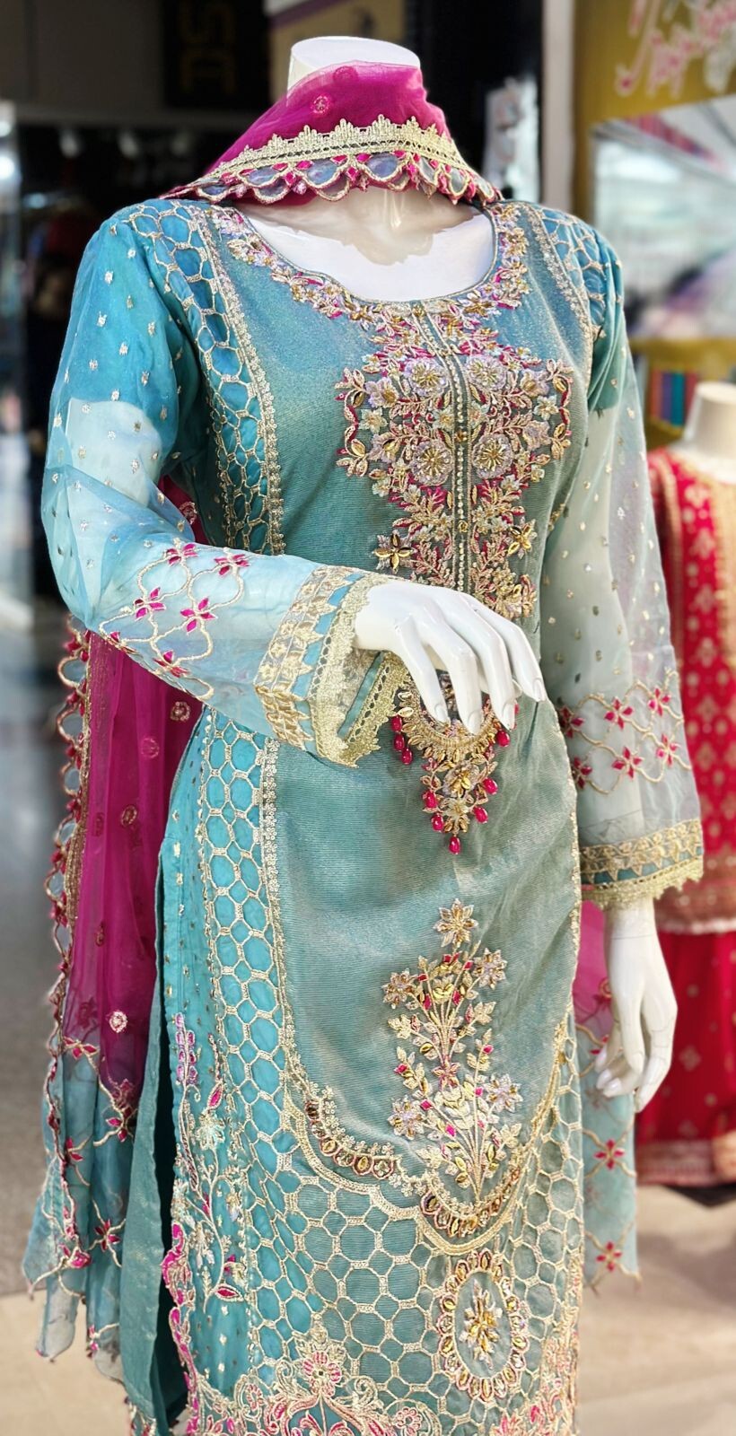 как выглядит Pakistani Readymade Collection Embroided Handwork Shirt With Gharara On Organza фото