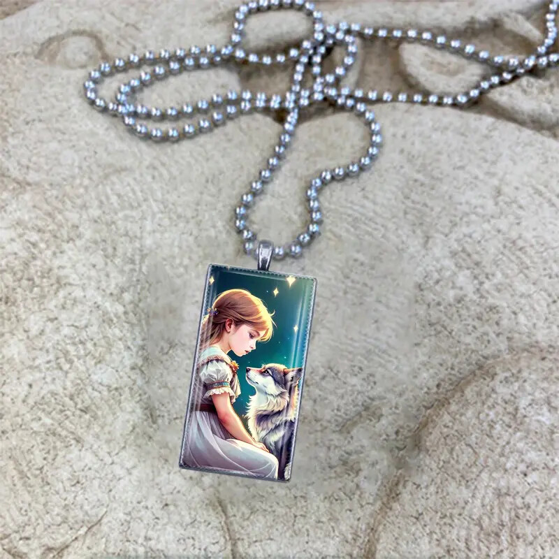 Creative Girl With Wolf Pattern Rectangular Pendant Necklace - Great Gift Idea