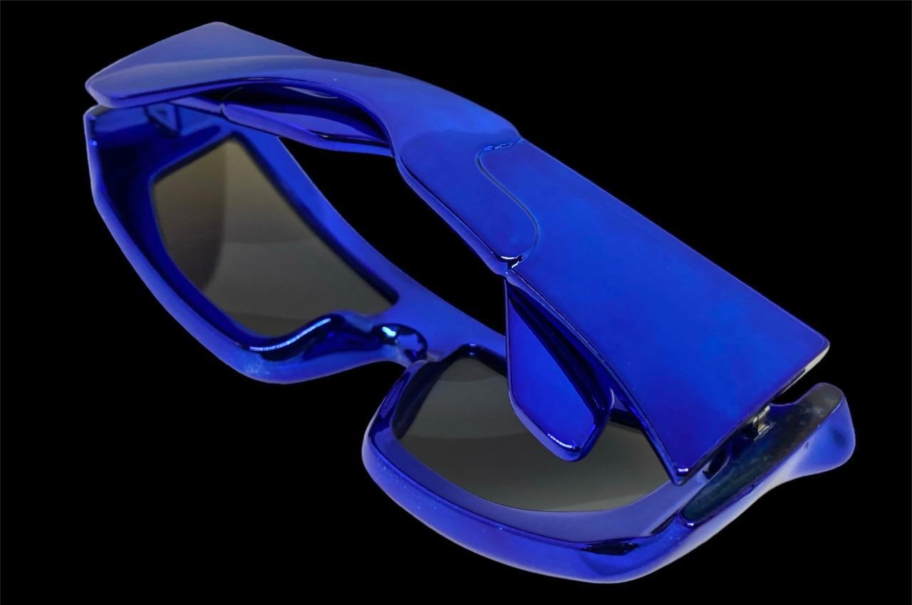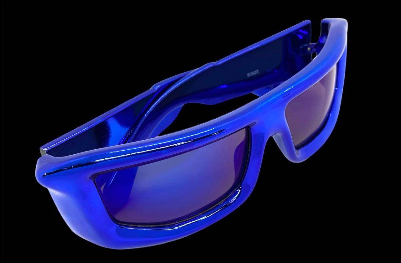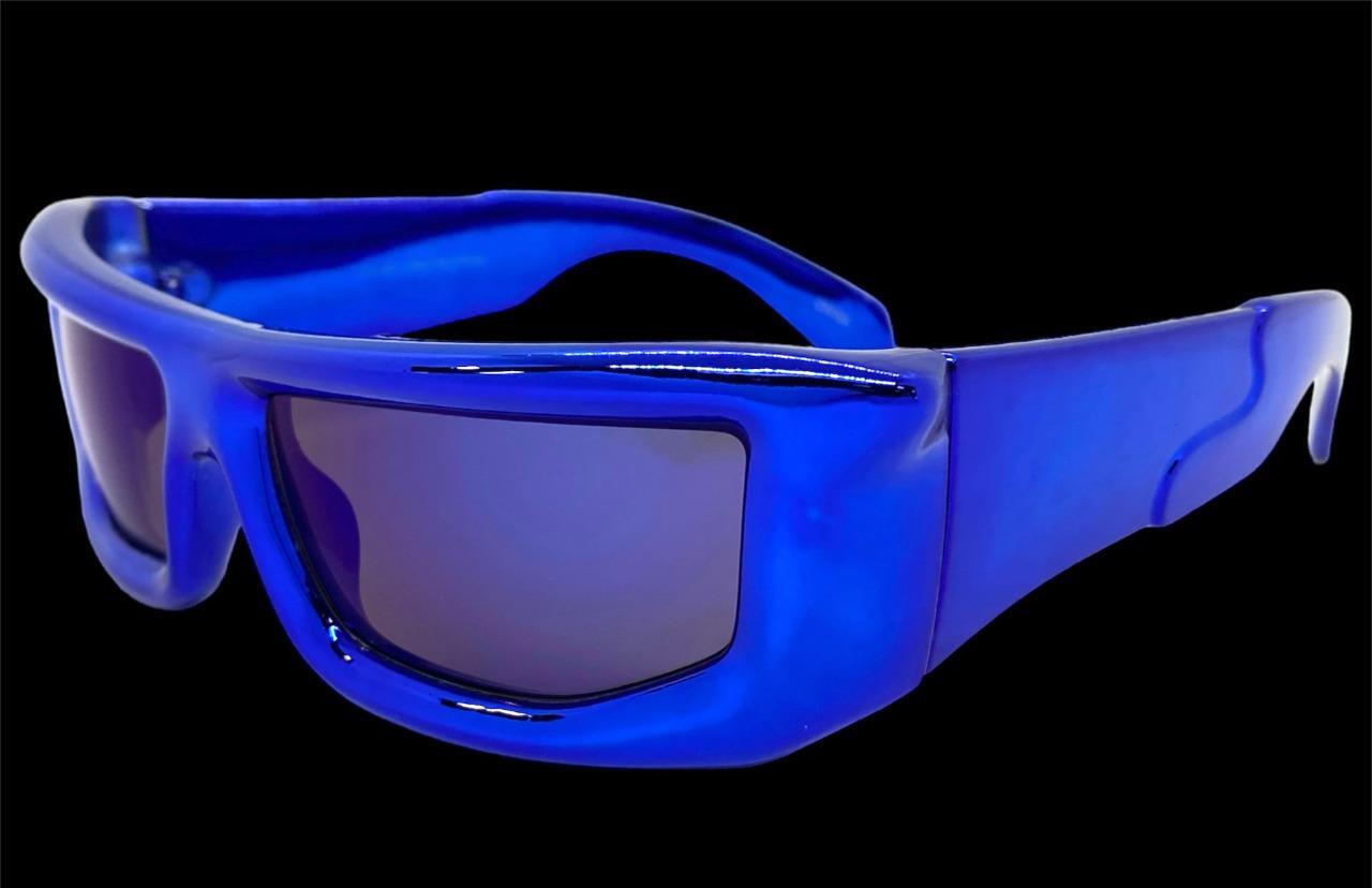 Sleek Modern Futuristic Biker Sporty Wrap SUNGLASSES Big Thick Blue Chrome Frame