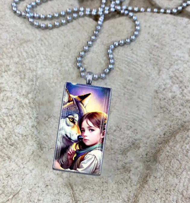 как выглядит Fashionable And Creative Little Girl And Wolf Rectangular Pendant Necklace фото