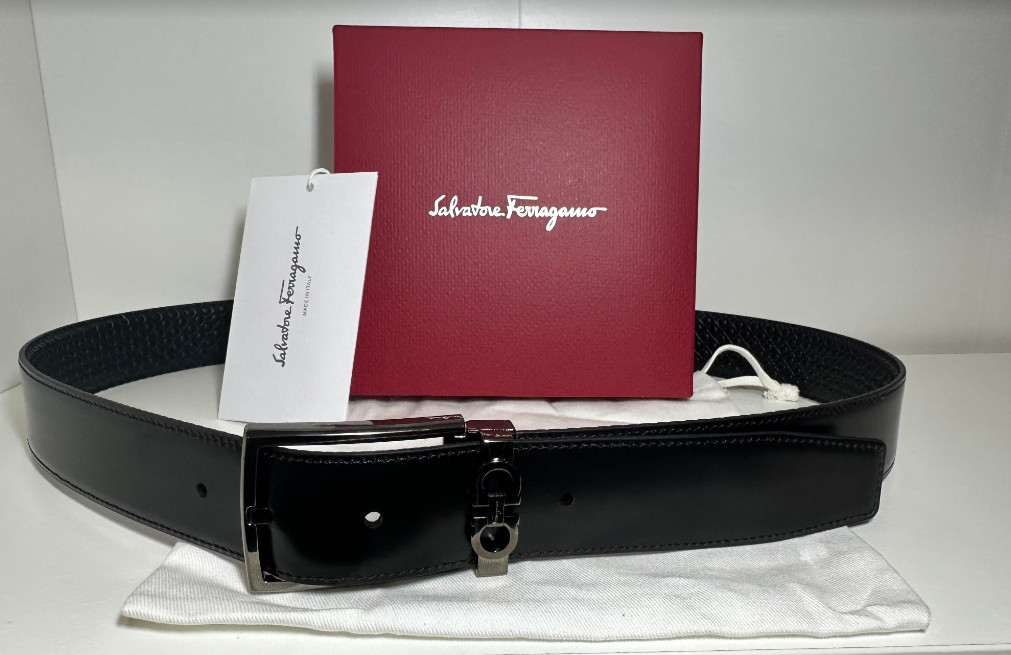ADJUSTABLE REVERSIBLE BLACK LEATHER SALVATORE FERRAGAMO BELT GUNMETAL BUCKLE