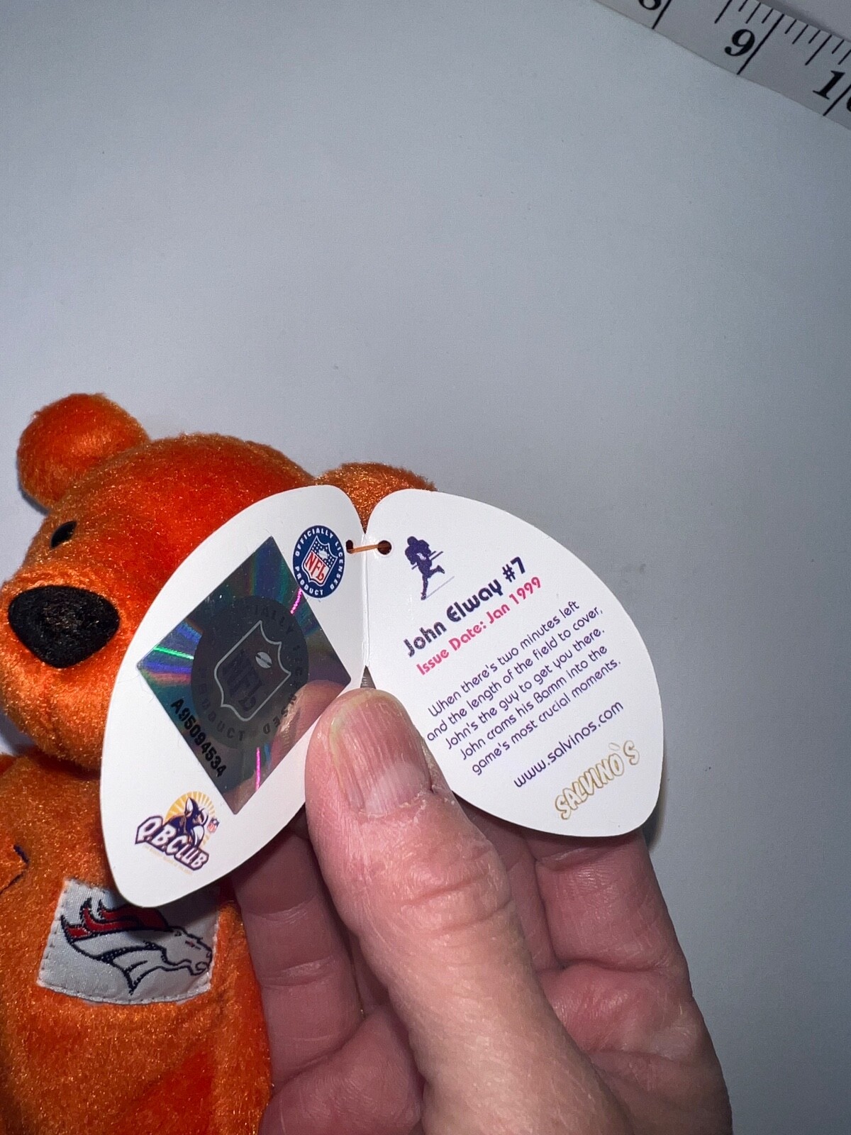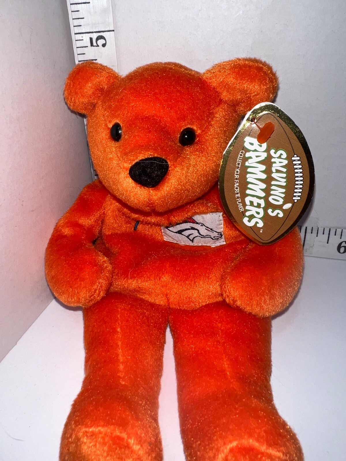 как выглядит John Elway 7 Denver Broncos NFL 1999 Salvinos Bammers Bear Orange 9" фото