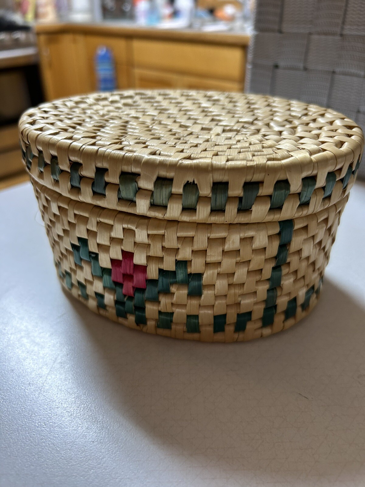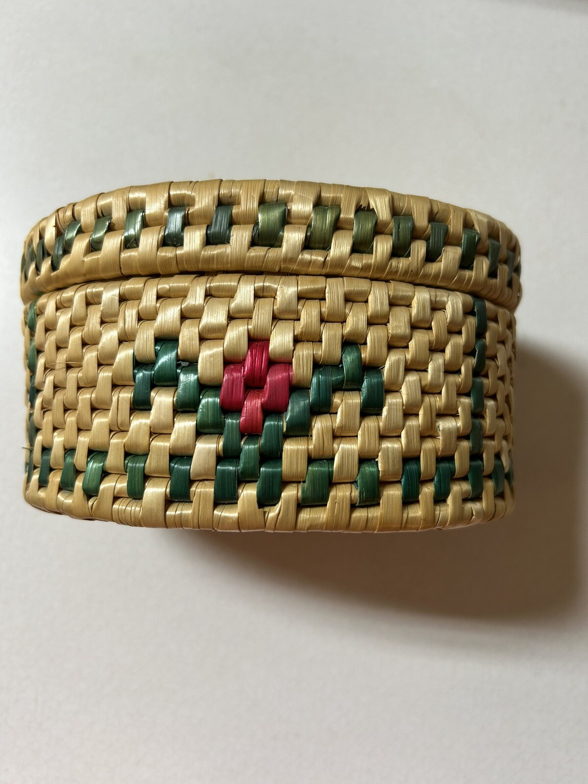 Woven Coil Straw Seagrass Basket/Lid Floral Oval 6x3.25x4.25 Southwest Boho EUC