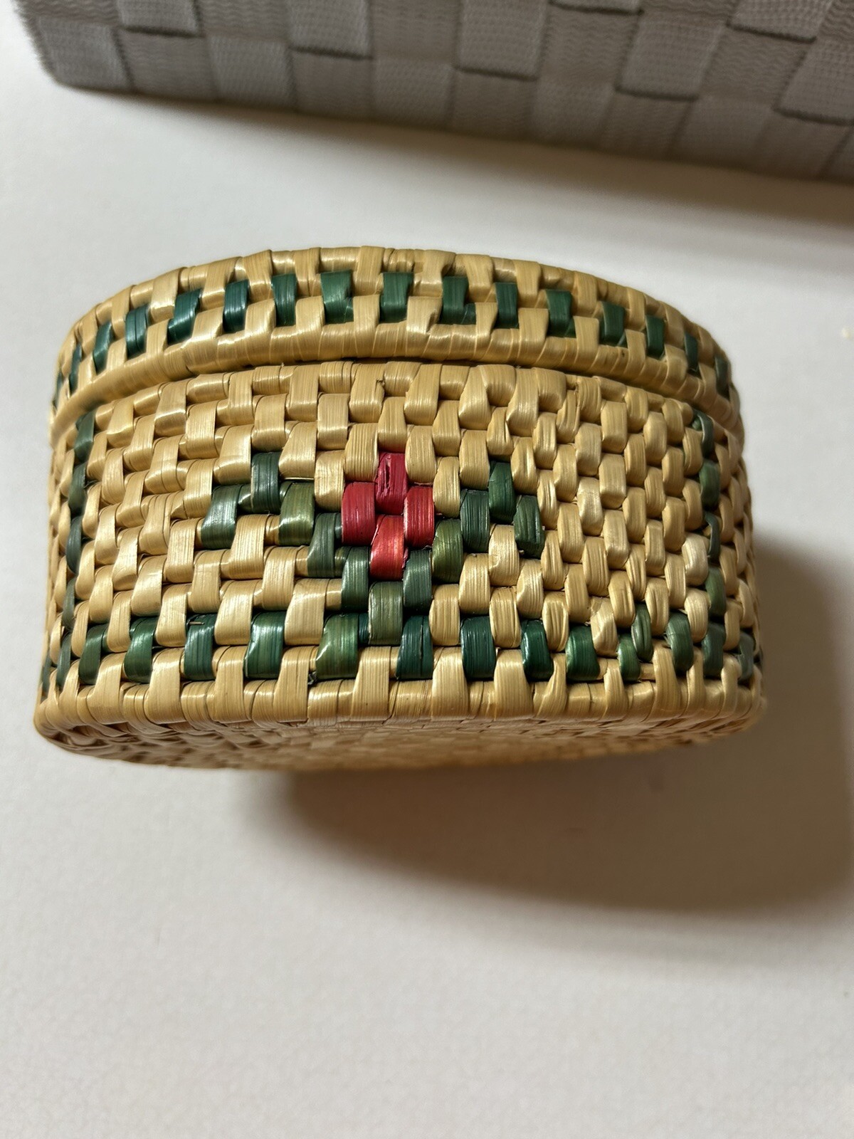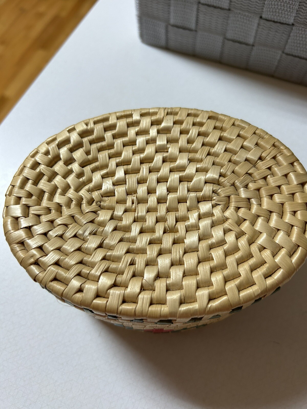 • Woven Coil Straw Seagrass Basket/Lid Floral Oval 6x3.25x4.25 Southwest Boho EUC