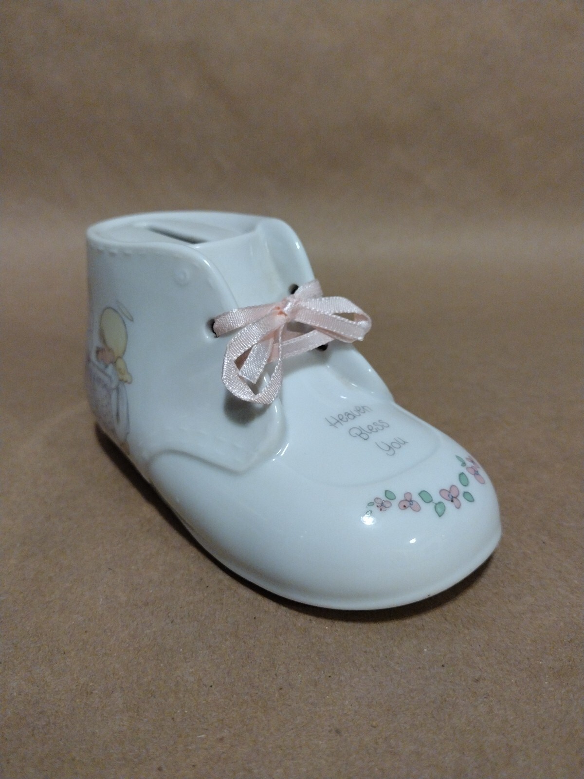 • Enesco Precious Moments "Heaven Bless You" Baby Girl Shoe Bank 1990