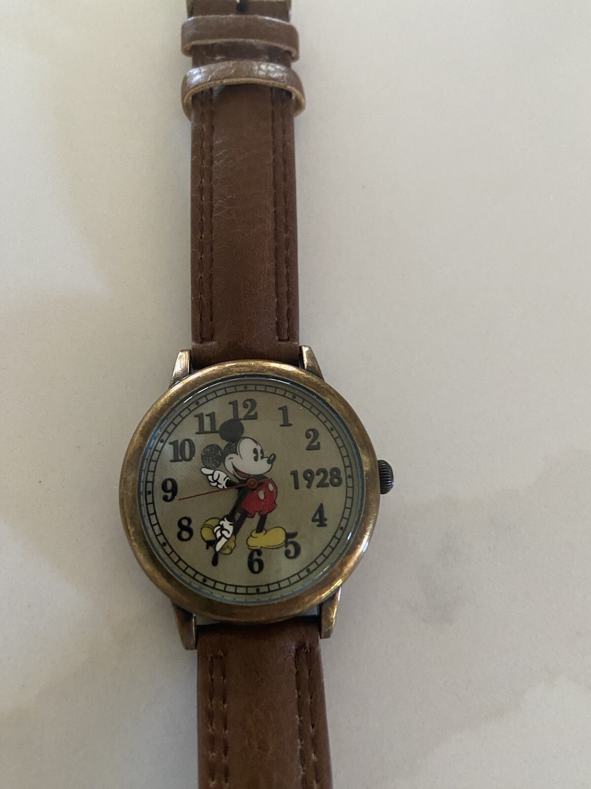 • Disney Mickey Mouse Unisex Gold Tone Leather Classic Moving Hands Watch Works